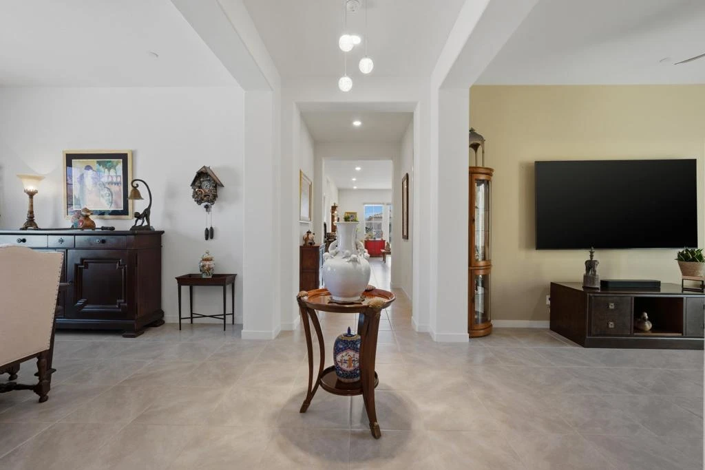 Welcome to Villa Portofino, the valley's premier 55+ community. This highly sought after Milano floorplan boasts 2341 square feet with a VERY open design. Only 2 years old, this home has been upgraded throughout. The great room, with sliding glass doors to the rear patio with 2 ceiling fan/light fixtures, is open to the kitchen with beautiful mountain views and an abundance of natural light. The kitchen boasts a new drawer microwave oven, marble backsplash and custom cabinetry with illuminated glass uppers, soft close cabinet doors and drawers with pull-out shelves. The primary suite has more of those amazing mountain views with a large soaking tub and even larger, new dual walk in shower. The den and dining room spaces could be modified into possible third and fourth bedrooms if desired. Tile throughout this home keeps it cool year-round. There's also a separate A/C split in the garage for year-round comfort. 15 Solar panels, owned, not leased, make this home extremely efficient to cool. The HOA fee covers Fire & Earthquake insurance on building, trash pick up, water for landscape, landscape maintenance and replacement, Cable TV including HBO and high speed internet. The 30,000 square foot Clubhouse offers 2 restaurants, a full gym, movie theater, billiards and game room, shuffleboard, bocce ball, pool and spa. Villa Portofino is located in the heart of the valley with El Paseo, The McCallum Theater, The Shops at Palm Desert and Eisenhower Medical Center just minutes away. Truly a Must-See. Make your appointment to tour this beautiful home today.
