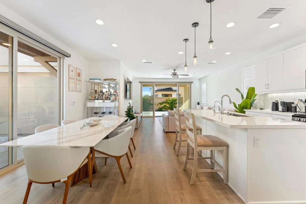 Welcome to elevated desert living in this stunning, 4-bedroom, 2.5-bath residence located in the highly sought-after University Park community of Palm Desert.Designed with modern elegance and upscale finishes throughout, this home showcases a bright open-concept layout, wide-plank flooring, and a show-stopping oversized white quartz island that anchors the gourmet kitchen, perfect for entertaining or everyday luxury living. Sleek white cabinetry, stainless steel appliances, designer pendant lighting, and an abundance of natural light create a clean, sophisticated aesthetic that feels straight out of a model home.For added comfort and convenience, the home comes partially furnished and equipped with a whole-house water softener system, enhancing water quality and everyday living.Upstairs, enjoy breathtaking mountain views that elevate your everyday experience, a true reminder you're living in the heart of the desert's beauty.The spa-inspired primary suite features dual vanities, a glass-enclosed shower, a soaking tub, and a peaceful retreat-like ambiance.Step outside and experience next-level community amenities: resort-style pool and spa, pickleball courts, kids' playground, lush greenbelts, and modern outdoor gathering spaces complete with fire features, all set against stunning mountain backdrops.Ideally located just minutes from the freeway, premier shopping, dining, and entertainment, this home offers the perfect blend of luxury, lifestyle, and convenience.Modern. Sophisticated. Turnkey.This is desert living -- elevated. Homes like this do not last. Schedule your private showing today.