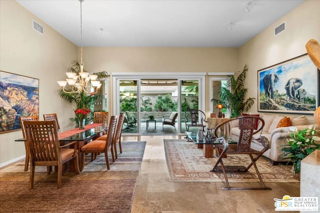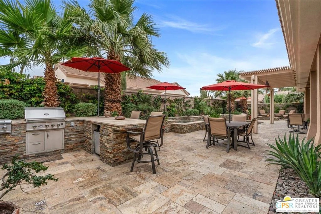 BACK ON THE MARKET - Buyer could not perform. The highly sought-after "Estate Model" Monaco is one of the community's most popular floor plans, offering 3 bedrooms and 3 baths in a thoughtfully designed layout that balances comfort, privacy, and effortless desert living. Ideally situated in one of the most desirable quadrants of the community known for minimal wind and sand intrusion and no freeway noise from the I-10 this move-in-ready residence is just moments from the Lakeview Clubhouse and conveniently close to the dog park, placing premier amenities right at your fingertips. A private attached casita, accessed directly from the front gated courtyard, features its own bedroom, spacious sitting/office area, and bath perfect for guests, extended family, or a private home office. Enter through the charming courtyard and leaded-glass double doors into the elegant great room, where polished Travertine flooring, soaring ceilings, and skylights create a bright, open, and welcoming atmosphere. French sliding doors open to a beautifully designed backyard featuring natural rustic Travertine flooring, an Alumawood pergola with misting system and fans, a sparkling saltwater Pebble Tech pool and spa, outdoor kitchen, and natural gas fire pit creating the ultimate indoor-outdoor lifestyle ideal for both relaxing and entertaining. The well-appointed kitchen showcases granite tile countertops, a large center island, and opens seamlessly to the family room and breakfast nook for easy everyday living and hosting. The spacious primary suite offers a comfortable sitting area with views of the pool and outdoor entertaining spaces, while the generous primary bath features dual vanities, a custom walk-in closet, walk-in shower, and soaking tub for a true retreat experience. Additional highlights include: All-new windows and sliders (2025), Owned and paid-for solar for energy efficiency, 7-year-old HVAC system, impressive laundry room with built-in cabinetry and abundant storage. Extended 2-car garage with mini-split A/C plus dedicated golf cart garage. Kitchen & Garage refrigerator, double oven, dishwasher, microwave, washer/dryer, and outdoor mini refrigerator included to convey with sale. This exceptional home blends comfort, privacy, and resort-style 55+ living in one of the community's premier locations. All interior furnishings available outside of escrow per inventory.