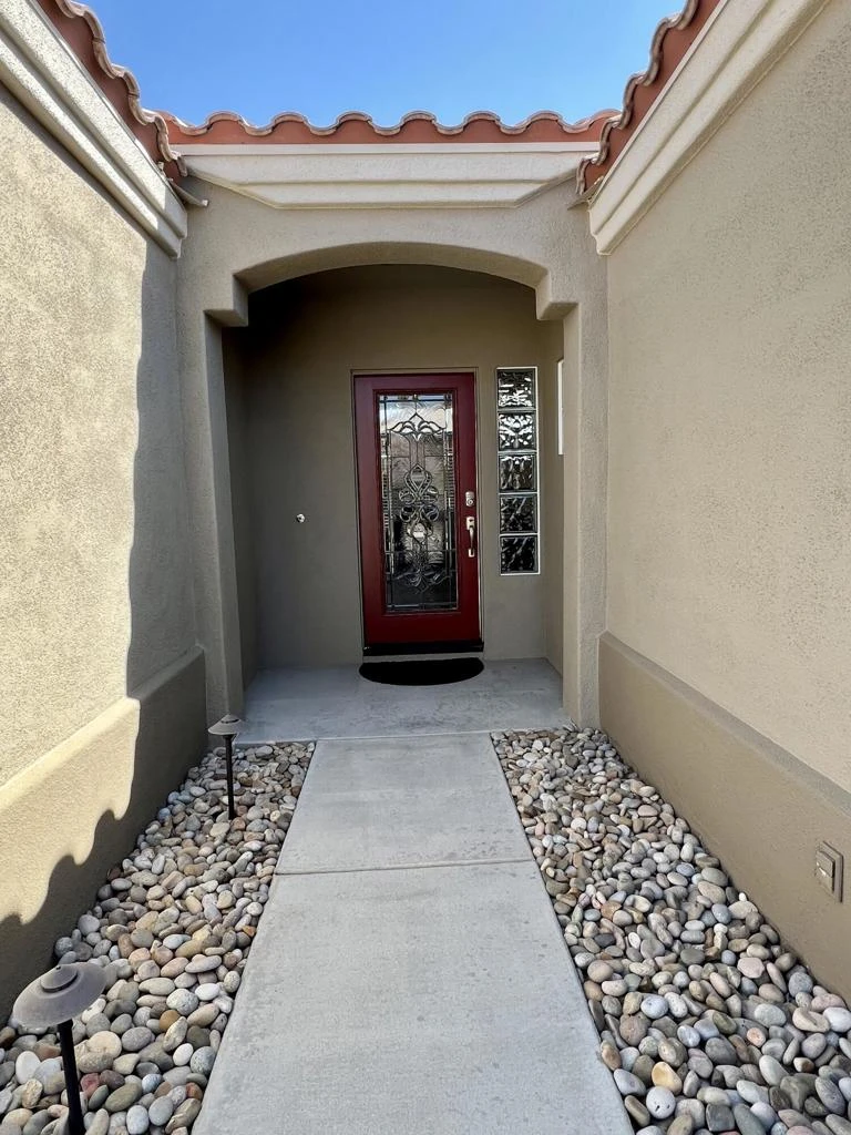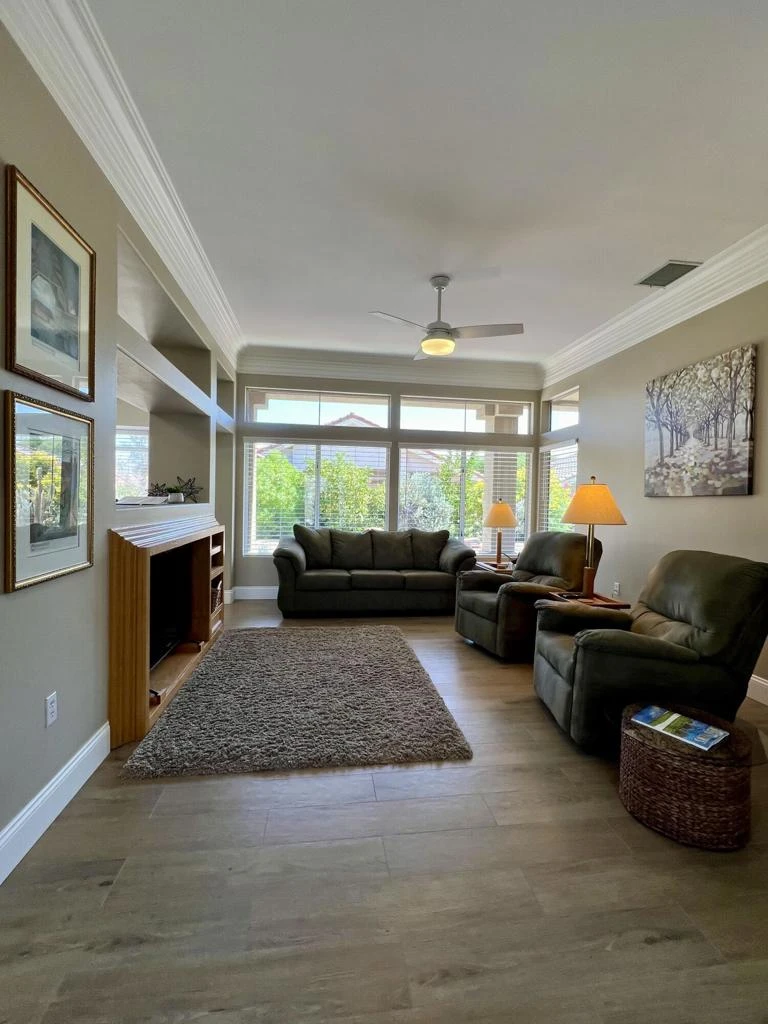 Short-term only; 4 months minimum. INCLUDES GOLF CART AND MONTHLY CLEANING! Available for 2026-2027 season. Sun City Palm Desert. Turnkey-furnished Gorham model on a corner lot. This one's SPOTLESS and includes monthly cleaning. Enter through a beautiful leaded-glass front door. 2 bedrooms/2 bathrooms. 1157sf. Newer wood-look tile and new baseboards throughout. NO CARPET. Freshly painted inside & out. Newer stainless appliances including newer washer and dryer. Crown molding in living room. Newer 58'' TV in living room; 39'' TV in master. Newer toilets. Newer ceiling fans in every room. Newer dishes, flatware, pots 'n pans. Newer gas BBQ. Newer king-size bed in master; twin beds in guest room. Inside laundry room with newer washer and dryer. Extended patio. Attached garage with direct access into house. Includes monthly cleaning, cable TV, internet, golf cart, & US/Canada calling. Electricity and Gas capped at $225 total per month.