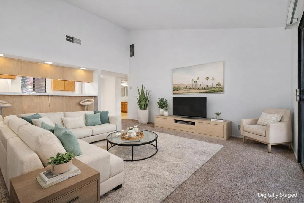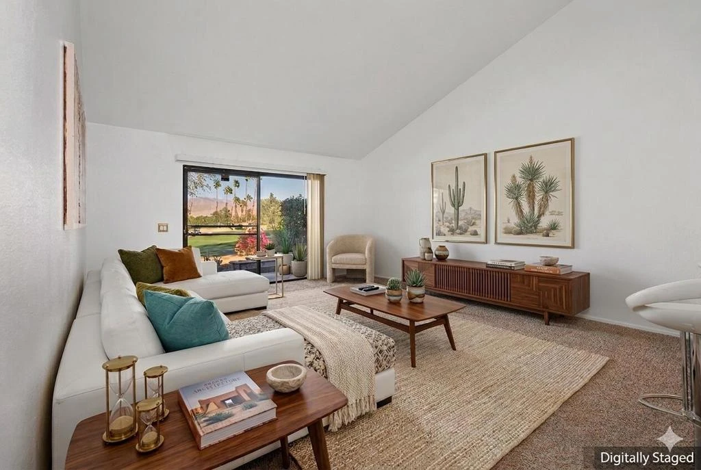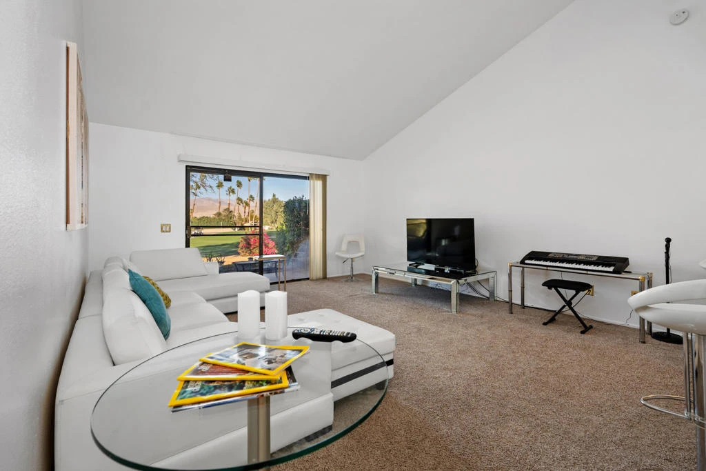 Priced to Sell! This charming single-level, 1-bedroom, 1-bath condo offers an open floor plan with vaulted ceilings, abundant natural light, and sliding glass doors that create seamless indoor-outdoor living. Enjoy stunning views of the San Bernardino Mountains and the 12th green from the large windows throughout. A rare enclosed two-car garage--valued at $35K--comes equipped with its own cooling system and a brand-new washer and dryer. The spacious bedroom features a ceiling fan, generous windows, and a sizeable walk-in closet. Just steps away from the pool and jacuzzi, this property is perfect for sports enthusiasts, seasonal visitors, personal retreats, or investors seeking strong rental potential. Short-term rental friendly with affordable permits. Palm Desert Resorter is known for its active, resort-style living and features 20 pools & spas, 28 pickleball courts & 7 tennis courts, the largest and most active in the Coachella Valley 18-hole championship golf course & driving range, Bocce ball, cafe, pro shop, clubhouse, and dining room with live music and social events. HOA dues cover exterior maintenance, cable, internet, trash, and 24-hour security. A/C HVAC unit motor was replaced in 2022. Located minutes from Indian Wells Tennis Garden, Acrisure Arena, El Paseo shopping and dining, and convenient freeway and airport access. Come relax and enjoy resort living at its finest- your desert escape awaits!