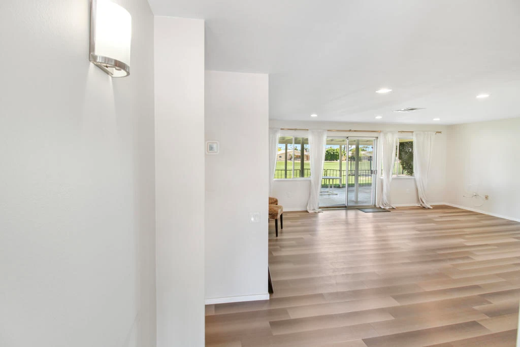 Well Maintained home on Golf Course, with 2 Bedrooms Plus a Large Converted Garage Bedroom/Bonus Room! Updated tile Plank Flooring throughout. Separate Laundry Room with Pantry Storage Shelves. Spacious Dining area adjacent to the Kitchen. Large Living Room opening to Covered Patio with View of Golf Course and East Facing Mountains. A Covered Carport Area with a Wide Driveway to allow 3 cars. Gardener service is provided by owner.