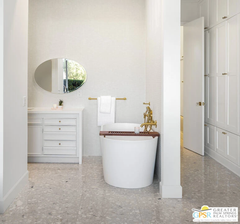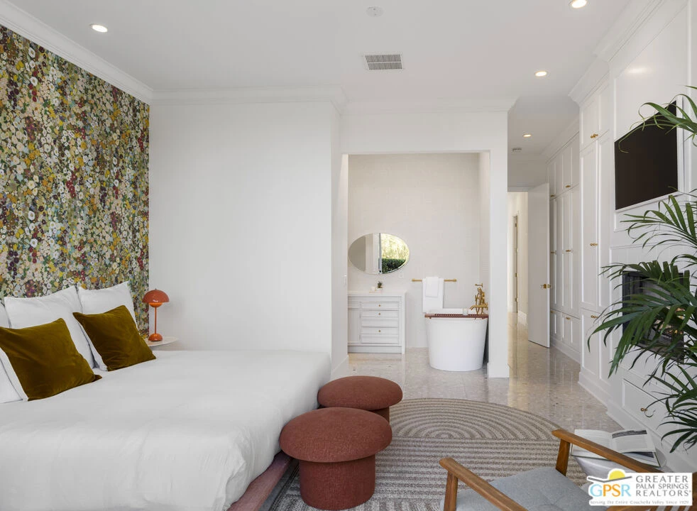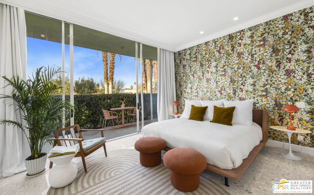 Live the good life in the prestigious Marrakesh Country Club, where luxury, comfort, and breathtaking views come together in perfect harmony. This fully furnished Hollywood Regency home offers spectacular golf fairway and mountain views, providing an unparalleled backdrop for relaxation. This home is a light-filled sanctuary, offering a seamless blend of contemporary, modern elegance and serene desert living. This clean, artful design with soaring ceilings, terrazzo tiled floors and abundant natural light is enhanced by expansive glass doors. The functional and bright kitchen opens to the dining and exterior courtyard. It features a charming breakfast area, quartz countertops and custom walnut cabinetry with an abundance of storage space. The luxurious Primary Suite offers an attached open concept spa-like ensuite bath and a walls of closet space. An elegant guest suite with serene courtyard and separate bath also has an oversized closet and locked storage area. The third bedroom is delightful and perfect for a secondary office space or library retreat. In addition, a multi purpose bonus space is used as an office. The Private Courtyard & Covered Patio are perfect for entertaining. Two-Car Garage with ample storage.