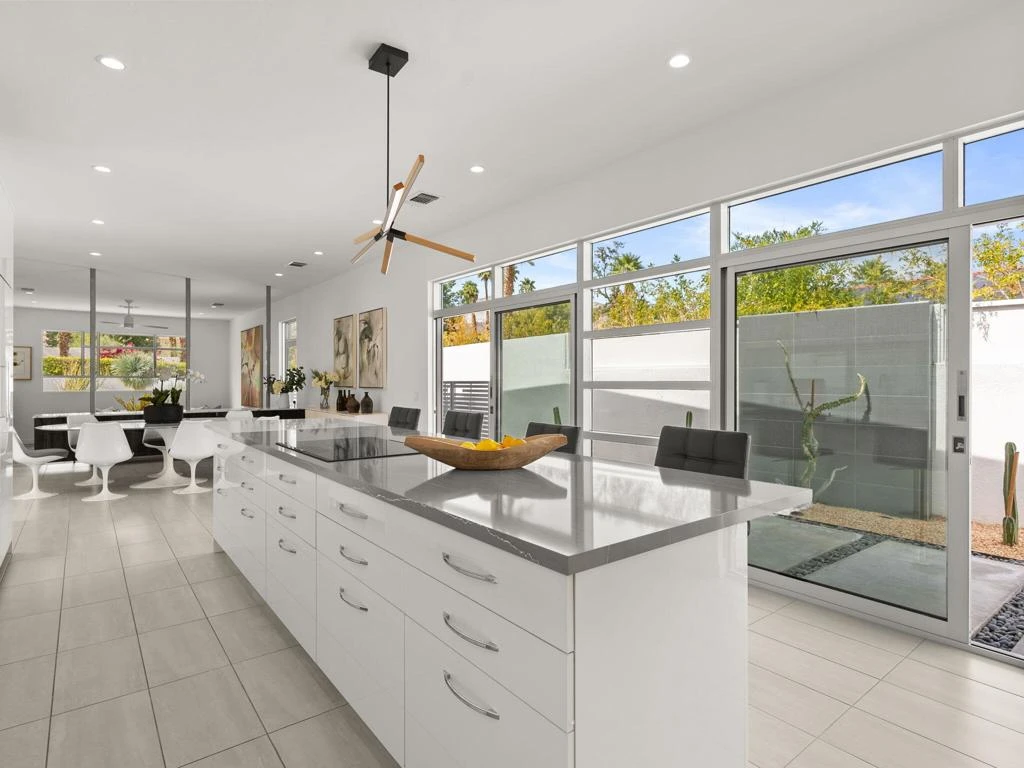 Reimagined both inside and outside by the talented owner-designer, this residence has been transformed into a modern masterpiece. Commercial-grade windows and sliders, arranged in a Mondrian-inspired composition of varying glass sizes and shapes, enhance the home's sleek lines, natural light, and dynamic color contrasts. This to-the-studs renovation includes a 38-panel solar system with three Tesla Powerwall batteries, a massive atrium with a lighted wall fountain and firepit, and two primary suites. The main suite features dual spa-like bathrooms, two custom walk-in closets, in-room laundry, and direct access to the backyard and gym. The secondary primary suite offers luxe carpeting, a designer ensuite bath, and a private patio. The striking ultra-modern kitchen boasts an expansive island, high-end appliances, and custom cabinetry with quartz countertops. Outdoor enhancements include a motorized pergola with recessed heat lamps and a detached structure that is currently used as a private gym. A spacious guest suite ensures comfort for visitors and also has a stunning en-suite bathroom. With panoramic mountain views to the east and west, the home is ideally located near the renowned El Paseo Shopping District, Historic Highway 111, and prestigious golf clubs, blending high-end functionality with modern sophistication. Seller is open to credit towards substantial RATE BUYDOWN dependent on offer.