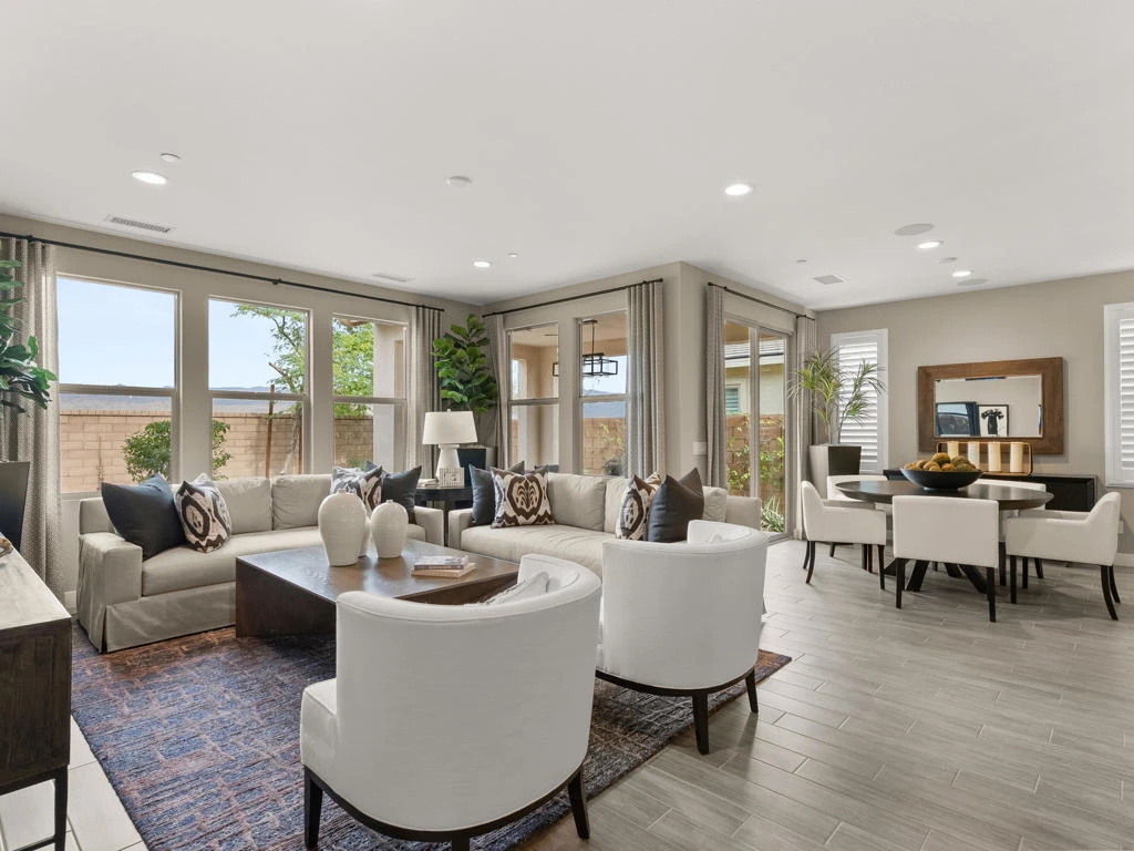 A rare opportunity to own a never-lived-in Ponderosa model home with gorgeous mountain views and immediate occupancy. Built by Ponderosa Home Builders, a developer known for superior craftsmanship, build quality, and enduring finishes, this thoughtfully designed and impeccably finished single-level, two-bedroom home with a spacious den showcases the quality and attention to detail for which the builder is known.The open-concept living area connects seamlessly to the kitchen, creating an inviting space ideal for both everyday living and entertaining. The kitchen features quartz waterfall countertops, stainless steel appliances, under-cabinet lighting, a walk-in pantry, and upgraded tile flooring and carpet, with finishes selected for timeless appeal and durability rather than trend-driven design.Eight-foot doors throughout, a tankless water heater, and a 5kW owned solar system reflect a strong focus on efficiency, comfort, and build quality. Large windows frame the surrounding mountain backdrop, enhancing the home's light, open feel. As a professionally curated model home, the residence showcases premium upgrades and designer furnishings available for separate purchase, offering buyers a convenient and customizable turnkey opportunity without construction delays or upgrade wait times.Residents enjoy access to a newly completed clubhouse featuring a resort-style pool and spa, modern fitness center, yoga lawn, and BBQ area. Conveniently located near shopping, dining, entertainment, and medical centers, with Palm Springs approximately twenty minutes away.An exceptional opportunity to own a pristine, move-in-ready model home with elevated finishes, owned solar, striking mountain views, and well-appointed community amenities, delivering a level of quality and readiness that sets it apart.