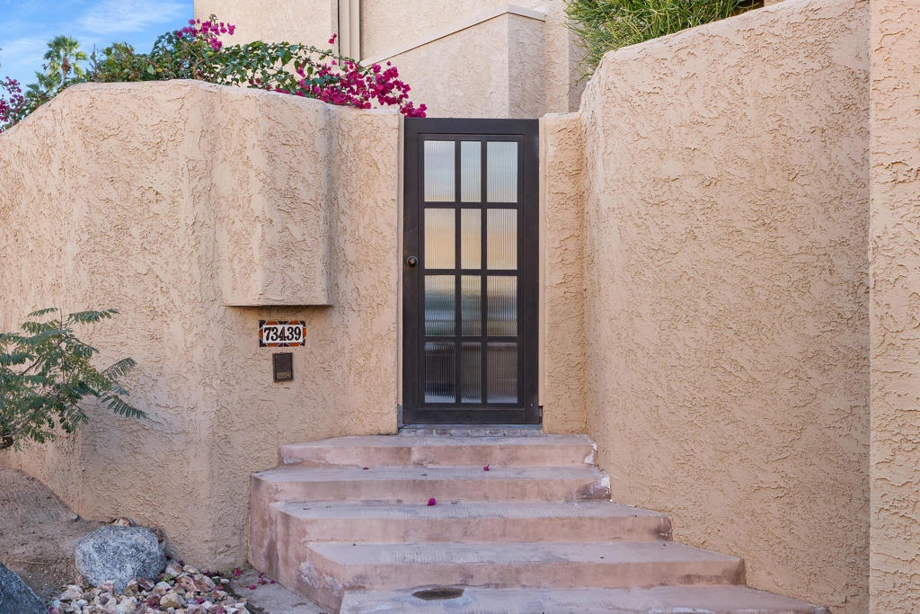 Approximately 1,502 square feet of well designed living space is offered in this two bedroom, three bathroom condo featuring a desirable floorplan. Both bedrooms include ensuite bathrooms, providing comfort for residents and guests alike. The interior has been refreshed with updated porcelain flooring on the main level, new interior paint, and upgraded kitchen countertops, creating a clean and inviting atmosphere filled with natural light. New dual pane sliding doors on the lower level enhance energy efficiency while opening to the private courtyard ideal for indoor outdoor desert living. An oversized two car garage offers ample parking and storage. A defining feature of the residence is the expansive sun deck, accessed from the second level and leading to the uppermost portion of the home. From this elevated vantage point, enjoy sweeping mountain views in every direction, including a direct outlook toward Eisenhower Peak, creating an exceptional setting within this community. Enjoy an active lifestyle at Ironwood Country Club, a private club featuring two 18‑hole golf courses, a fully equipped fitness center, tennis and pickleball courts, and a stunning clubhouse. Membership is by application and requires sponsorship.