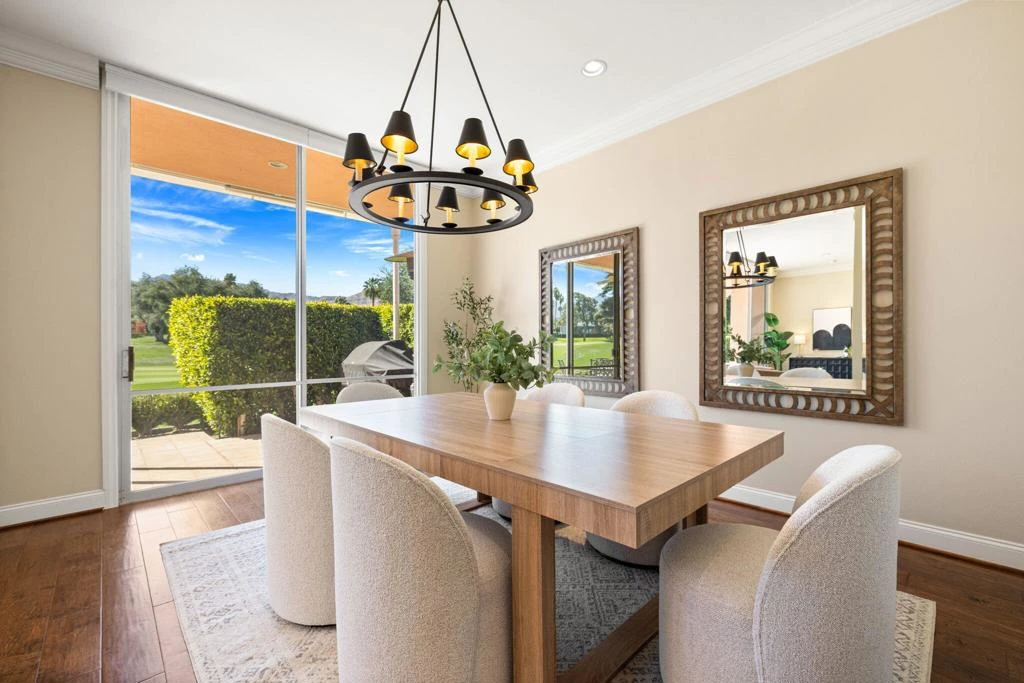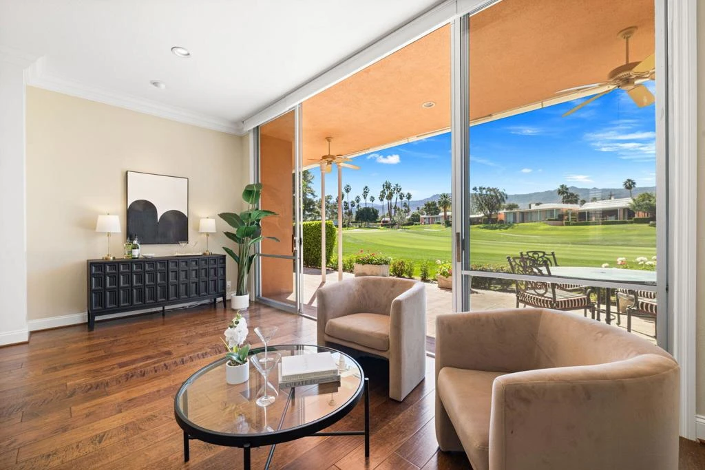 Newly Staged! Set within the iconic gates of Marrakesh Country Club--celebrated as the Jewel of the Desert--73587 El Hasson presents a refined opportunity to enjoy classic Hollywood Regency architecture paired with thoughtful modern updates, all in a peaceful golf course setting.This spacious 3-bedroom plus office, 3-bath villa spans approximately 2,629 square feet and is positioned along the pristine 18-hole course overlooking the 5th fairway, offering east- and west-facing views and a sense of privacy throughout. The flexible floor plan includes a generous living room with a fireplace, traditional crown molding, and hardwood flooring, along with dramatic 10-foot sliding glass doors that open to an expansive private patio--ideal for indoor-outdoor entertaining. One of the bedrooms has been thoughtfully converted into a large den with a second fireplace, creating an inviting space for media, lounging, or a home office.The kitchen is well-suited for both everyday living and entertaining, featuring abundant built-ins, a serving island, and direct outdoor access. Recent updates enhance both comfort and functionality, including a new wine fridge, dishwasher, electric shades, awning, and a new roof--providing peace of mind and modern convenience. Furniture available for purchase outside of escrow. Residents of Marrakesh Country Club enjoy access to an array of exceptional amenities, including an 18-hole executive golf course, tennis, pickleball, bocce ball, croquet, a fully equipped fitness center, and a beautifully remodeled clubhouse offering both casual and fine dining, all framed by sweeping mountain and fairway views. Ideally located just moments from El Paseo's renowned shopping and dining, Marrakesh offers a lifestyle defined by elegance, ease, and timeless desert appeal. A rare opportunity to own a classic John Elgin Woolf-designed home and experience the Magic of Marrakesh.