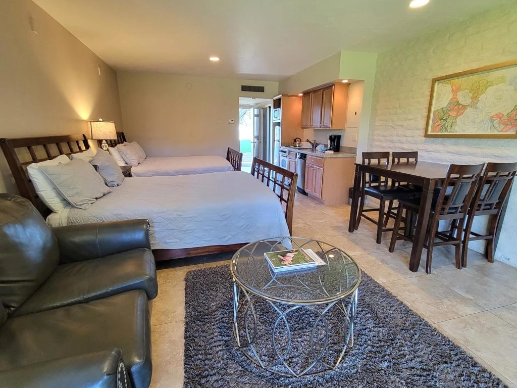 Do not miss your chance to have your own little piece of paradise in the desert! Beautifully appointed and recently repainted interior to brighten/refresh and turnkey furnished studio with complete kitchen, 2 Queen Beds, dining area and living area. Located near the main pool, pro shop and restaurant. Relax on your patio, taking in the gorgeous mountain views. Swim in either the main pool/spa or one of 3 HOA pools/spas. Enjoy other activities at Shadow Mountain such as tennis, pickleball and volleyball. Golf at nearby Shadow Mountain Golf Course or dine and shop on El Paseo located just a few blocks away. ALL UTILITIES are including in the QUARTERLY HOA fees. Short term rentals are permitted. Main pool, pro shop, tennis and fitness center require annual membership. This is a great unit for your vacation getaway or rental. Shadow Mountain Unit # is 121.