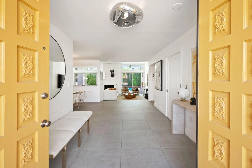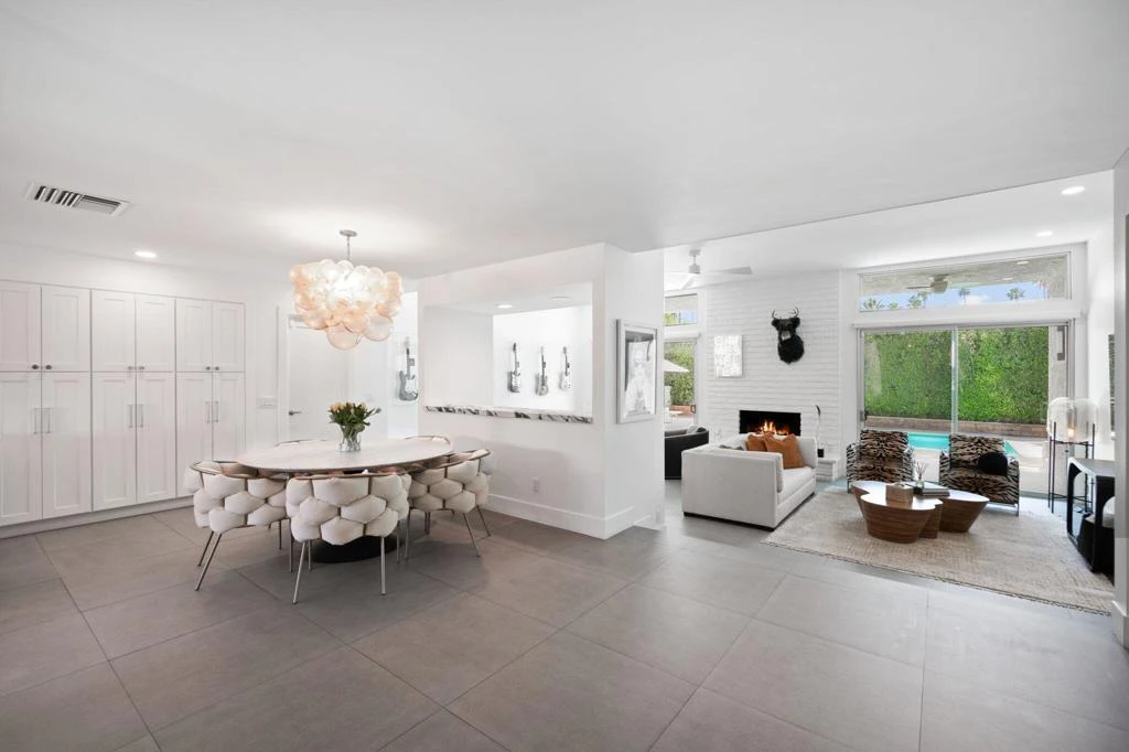 Designed by acclaimed New York designer Deux Ellis, this South Palm Desert home for sale offers modern desert living along Shadow Mountain Golf Course with a desirable south-facing backyard and stunning mountain views.Clean architectural lines and curated designer finishes define the interior, including stone flooring, Italian leather marble countertops, Restoration Hardware fixtures, and statement lighting by Tom Dixon and Oly Studio. The open-concept kitchen features stainless steel appliances and bar-top seating, flowing seamlessly into a sunken living room with a brick fireplace--an inviting space designed for entertaining and everyday comfort.Expansive windows and sliding doors flood the home with natural light and open to a private, south-facing backyard retreat. The sparkling pool, covered patio, multiple seating spaces, and mature citrus trees create a true resort-style setting with year-round sunshine.Each bedroom offers direct patio access for effortless indoor-outdoor living. A separate office provides flexible space for remote work, creative use, or wellness.A rare feature in South Palm Desert, the property includes gated RV parking behind a private gate, along with a two-car garage and golf cart space--ideal for recreational vehicles, desert toys, or additional storage.No HOA. Prime location just minutes from El Paseo shopping and dining, hiking trails, and within the Washington Charter School District.This home makes for an ideal full-time residence, seasonal retreat, or investment opportunity in prime South Palm Desert.