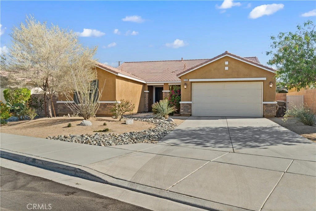 Welcome to this beautifully maintained single-story home located in a quiet cul-de-sac in the heart of Palm Desert. Offering 3 bedrooms, 3 bathrooms, and 1,991 square feet of living space, this home combines comfort, efficiency, and ideal desert living. As you enter, you're greeted by a spacious and flexible living area currently set up as a dining space—perfect for entertaining or adapting to your needs. Just beyond, the main living room sits open to the kitchen, creating a seamless flow for everyday living. The kitchen features granite countertops and stainless steel appliances. The home offers a combination of tile and wood flooring throughout, adding both style and functionality. The primary suite is thoughtfully positioned on its own side of the home, separate from the other bedrooms, offering added privacy. The spa-inspired ensuite bath features a soaking tub and a walk-in shower, creating a relaxing retreat. Additional upgrades include fully owned solar panels, a tankless water heater, dual-pane windows, and an electric vehicle charging setup in the garage. The garage also features durable epoxy flooring for a clean, finished look. Step outside to enjoy a full-length covered patio complete with a commercial-grade misting system—ideal for staying cool during warm desert days. The front yard features low-maintenance desert landscaping.
