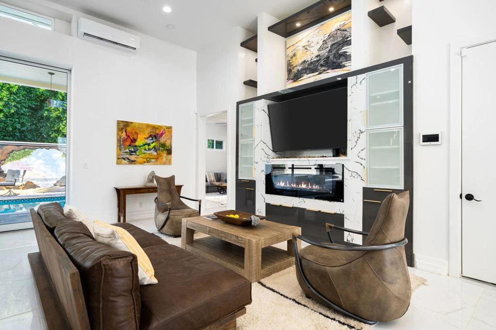 El Paseo shopping district, this nearly new custom home blends artistic style and opulent luxury in a generous single-level design. A private cul-de-sac homesite of nearly 10,019 s. f. reveals a pool and spa, custom mural, a fireplace and built-in BBQ. Custom etched-glass entry doors open to a spacious and welcoming great room that looks out to the pool and mural through massive slide away glass doors. Crowned by a high ceiling with clerestory windows, this fabulous space combines a living room with linear fireplace and custom built-ins, a dining room with wet bar, and a stunning European-inspired kitchen with custom high-gloss cabinetry, an oversized double-waterfall island with seating, quartz countertops, a full backsplash, walk-in pantry, and black-stainless Samsung appliances including a double-oven, French-door refrigerator and five-burner cooktop. Approximately 3,755 square feet, the home ensures comfort and privacy with five ensuite bedrooms and six baths. One bedroom is ideal for guests and boasts a kitchenette, washer and dryer and separate entrance. The primary suite opens to the outdoors via three sets of French doors and hosts a bar with wine refrigerator, a freestanding tub, walk-in rain shower, walk-in closet and LED mirrors. Embellishments throughout the residence include custom glass doors and shower enclosures, large-format porcelain tile, on-trend LED lighting fixtures, art niches and more. Flex Solar on property.