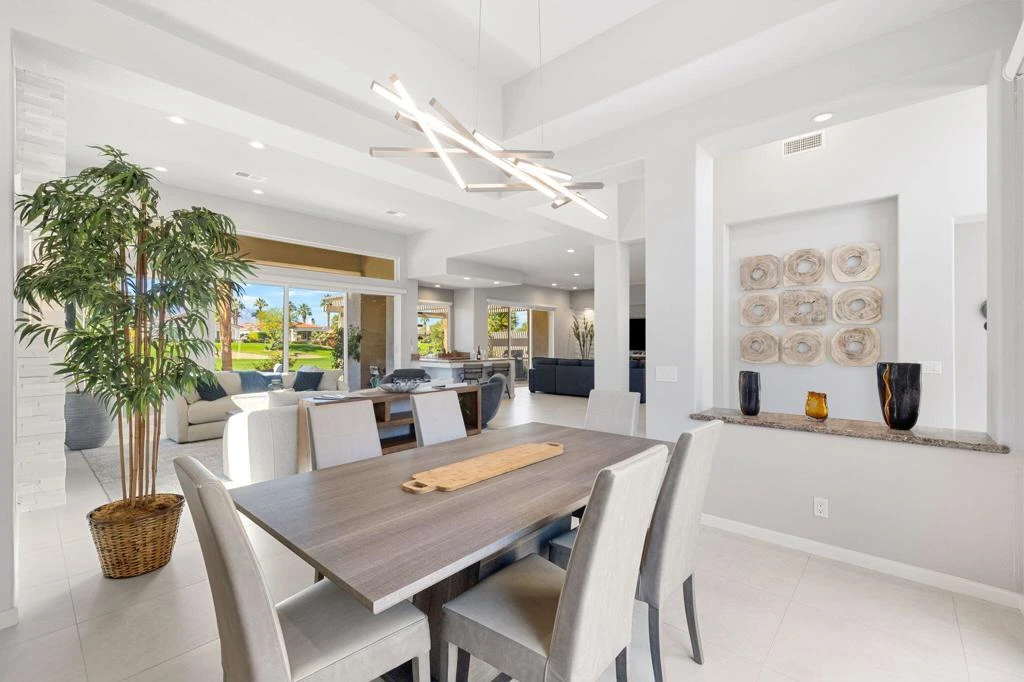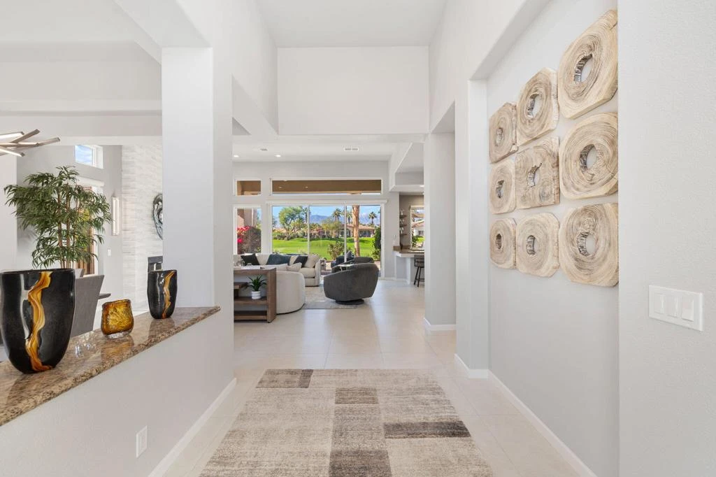 Beautifully remodeled Bougainvillea 2 with unforgettable west-facing water, fairway and mountain views! This 3BD/3.5BA, 2,742 sq. ft. home lives like a modern desert retreat - featuring sleek 24x24 Italian quartz tile, wool Berber carpet, fresh paint inside and out, and designer furnishings throughout. The living space feels bright and open with the removal of pony walls and columns, creating a seamless flow between the kitchen, dining, and great room areas. Enjoy a reimagined great room with a new gas fireplace insert, custom stone surround, recessed TV walls, and all-new LED lighting. The kitchen shines with freshly painted cabinetry and new appliances including refrigerator, dishwasher, and wine fridge. Smart-home upgrades include Nest thermostats, Lockly camera door lock, smart TVs, and new blinds with blackout in the primary. Outdoors, relax under the 17-ft remote-control awning, entertain with natural gas hookups for fire table & BBQ, and enjoy refreshed landscaping and gorgeous golf course views. Turnkey, stylish, and sitting on Arroyo #16 - this home delivers the ultimate Indian Ridge lifestyle. Sold furnished. Club Membership available.