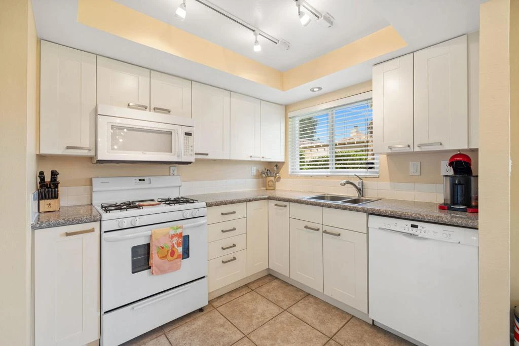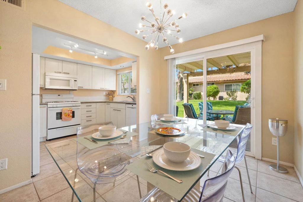 Welcome home to a beautifully upgraded residence that blends the privacy of a single-family home with the ease of condominium living. Set within an intimate, gated community of 108 detached homes, this property offers a serene retreat enhanced by thoughtful improvements and timeless design.An elegantly remodeled kitchen serves as the heart of the home, showcasing newer cabinetry, granite countertops, updated appliances, and modern fixtures. The open layout flows seamlessly into the dining area, creating an inviting space for everyday living and effortless entertaining. Both bathrooms have been tastefully upgraded with custom vanities and sophisticated shower enclosures.Fresh paint, new carpet, dual-paned windows and doors, and ceiling fans contribute to year-round comfort and energy efficiency. The living room, anchored by a cozy fireplace, provides the perfect setting for cool desert evenings. Warm, neutral decor and the option for furnishings make this home move-in ready.The private patio--enhanced with an Alumawood awning--offers a peaceful outdoor escape, ideal for morning coffee or sunset relaxation. A 2-car attached garage adds convenience, while interior laundry elevates everyday functionality.Positioned on a lush greenbelt in a quiet interior location, the home enjoys easy access to the community's resort-style amenities, including two sparkling pool and spa areas and a tennis court. With low HOA dues and proximity to shopping, dining, freeway access, and the highly regarded Desert Sands Unified School District, this property is an exceptional choice for both seasonal enjoyment and full-time living.