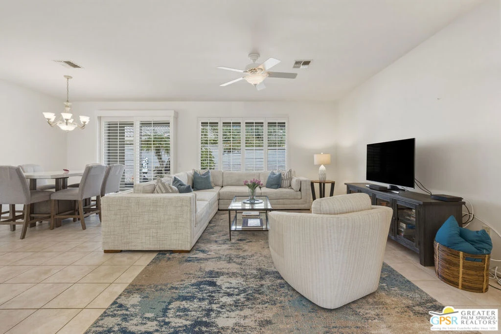 Welcome to Sun City Palm Desert where resort-style living is simply part of everyday life. Behind the 24-hour guard-gated entrance, you'll discover an extraordinary array of amenities designed for both recreation and relaxation. Enjoy 20 pickleball and tennis courts, two beautifully maintained 18-hole golf courses with a driving range, five heated swimming pools, and three stunning clubhouses that serve as vibrant social hubs. Residents also enjoy billiards, a grand ballroom, two on-site restaurants, a martini and coffee bar, a theater, technology center, library, arts & crafts, two dog parks, and RV parking. With more than 80 clubs and interest groups, there's truly something for everyone whether your passion is fitness, creativity, learning, or simply connecting with neighbors. Ideally located near the Mountain View Clubhouse, this popular Montego model offers 2 bedrooms plus an office/den (or optional third bedroom) and a spacious two-car attached garage. A transom window above the entry door welcomes natural light, setting the tone for the home's bright, open great-room design. Tile flooring flows throughout the main living areas, while plush carpeting adds comfort in the bedrooms. White plantation shutters provide timeless style and privacy. The kitchen features warm maple cabinetry, Corian countertops, and a cheerful breakfast nook perfect for casual dining. The generous primary suite offers direct access to the backyard, a large walk-in closet, dual vanities, and a walk-in shower. Thoughtful separation between the primary and guest bedroom ensures privacy for both owners and visitors. Step outside to your private rear patio, surrounded by mature landscaping that creates a serene setting with no direct neighboring views. Whether enjoying morning coffee or relaxing under the covered patio in the evening, this outdoor space offers peaceful desert living at its finest. Experience a beautifully maintained home within a vibrant, amenity-rich community where every day truly feels like a vacation.