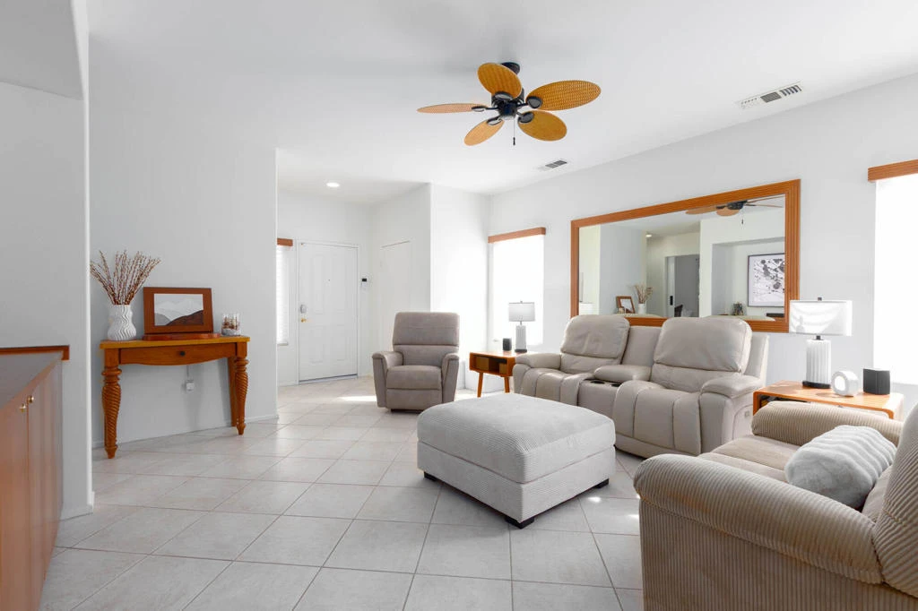 Immaculate and spotless Turnkey Elegantly Furnished, plus, Home for Sale in Sun City Palm Desert . Pasadena Model. This home is where the proverb ''GOOD THINGS COME in SMALL PACKAGES '' fits to a T. The home features a Great Room with an 85 inch TV, a Master Bedroom with Ensuite and a Custom Walk-in Closet , Den used as guest bedroom and has a beautiful Barn Door. The house has Newer Windows, Tile Flooring throughout , furniture is less than 2 years old, and only used seasonally. Kitchen has a new gas range. For laundry, a new Washing Machine ... ALSO included are TWO Electric Bikes , and a Golf Cart with New Seats, Batteries and more. A list of all furnishings, upgrades and more is available. A relaxing south facing Backyard with a covered patio a raised garden area and finished floor to enjoy the Desert mild winters. Low maintenance landscaping, 2 Car Garage Finished with Epoxy Floors. This home is ideal for a retiree interested in Sun City Palm Desert or looking to downsize. Gated with 24 hr. Security Guard. Just bring your toothbrush and suitcase and enjoy life . Please make sure to check the PHOTOS of this immaculate home. If you are a golfer, Sun City has 2 golf courses, sports courts, indoor and outdoor pools and spas, and much much more to list. The HOA Fee Includes Cable, Internet,Pest Control , and the Private neighborhood Pool & Barbecue. You do not want to miss this one!
