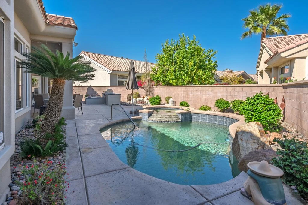 Sun City Palm Desert - Emerald. Ideally located near the Mountain View Clubhouse, this estate-model home sits on a one-of-a-kind oversized pie-shaped yard that provides an open and spacious fee and is in better condition than the day it was built. The north-facing rear yard is designed for resort-style outdoor living with a pebbletec pool with cascading spillover spa, gas fire pit, barbecue island and generous patio space for relaxing or entertaining. Exceptional curb appeal is highlighted by a gated front courtyard, double-door entry, updated paint scheme and salt-finished hardscape. Offered furnished. Inside, diagonally laid tile flooring runs throughout. The foyer and greatroom feature dramatic 12-foot coffered ceilings with uplighting, creating a light and open environment. Shutters are used throughout the home. The spacious kitchen has corian counters, a chef's island with breakfast bar, skylight, raised panel cabinetry with pullout shelves, and stainless appliances including Viking and Sub-Zero. The adjacent family room features a custom built-in media center. The primary suite has a bay window and a large walk-in closet with mirrored wardrobe doors. The primary bathroom includes dual sinks, a sitting vanity, skylight, stall shower with textured glass doors and an oversized spa tub with cultured marble surfaces. The guest suite also has mirrored wardrobe doors and an ensuite bathroom with shower/tub and tile surrounds. The guest bedroom includes a custom built-in desk and shelving along with French doors that open to the front courtyard. Additional features include a laundry room with utility sink and extensive cabinetry, a 2+ golf cart garage with abundant built-in storage, dual American Standard A/C systems new in 2017 and a 50-gallon water heater installed in 2016. This beautifully maintained home combines space, quality and an outstanding location within Sun City Palm Desert.