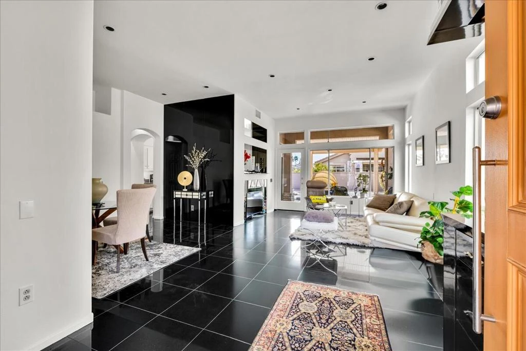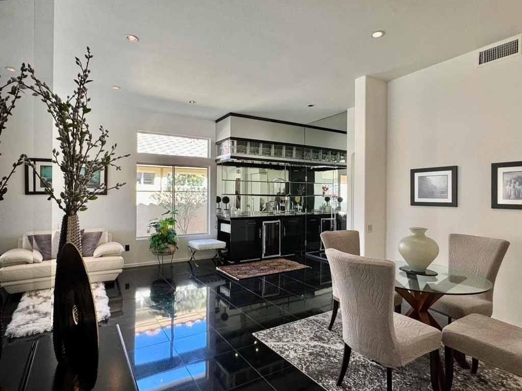 Spectacular Sun City Palm Desert home ideally located and enhanced with numerous custom upgrades. Exceptional curb appeal welcomes you with a paved driveway and stacked-stone accents. Step inside to an open, inviting living space featuring a built-in wet bar with beverage refrigerator, elegant ebony marble flooring, and French door that opens to a serene backyard retreat.The kitchen offers Caesarstone countertops, a breakfast bar, see-through pantry, convenient pass-through to the living room, and a sun-filled dining alcove surrounded by windows. A sliding glass door provides easy access to the outdoor living areas.Enjoy desert living at its best on the spacious patio with extended cover, flagstone, and low-maintenance landscaping. The private primary suite features charming French doors that look onto the walled rear yard. The ensuite bath includes a dual-sink vanity, tub/shower combination, and a custom walk-in closet.The guest bedroom is positioned on the opposite side of the home for maximum privacy. The highly upgraded guest bath showcases marble wall finishes, a step-in bath and shower, and custom vanity with upgraded fixtures.Additional highlights include custom flooring throughout, ceiling fans, and upgraded closets. The former laundry room has been converted into a functional office with built-in desk and cabinetry, while the washer and dryer have been relocated to the garage. The two-car garage is complete with attractive built-in storage cabinetry, a quiet garage motor, and coded entry.