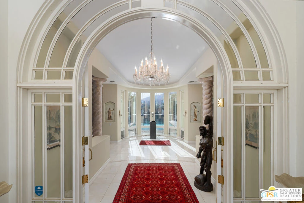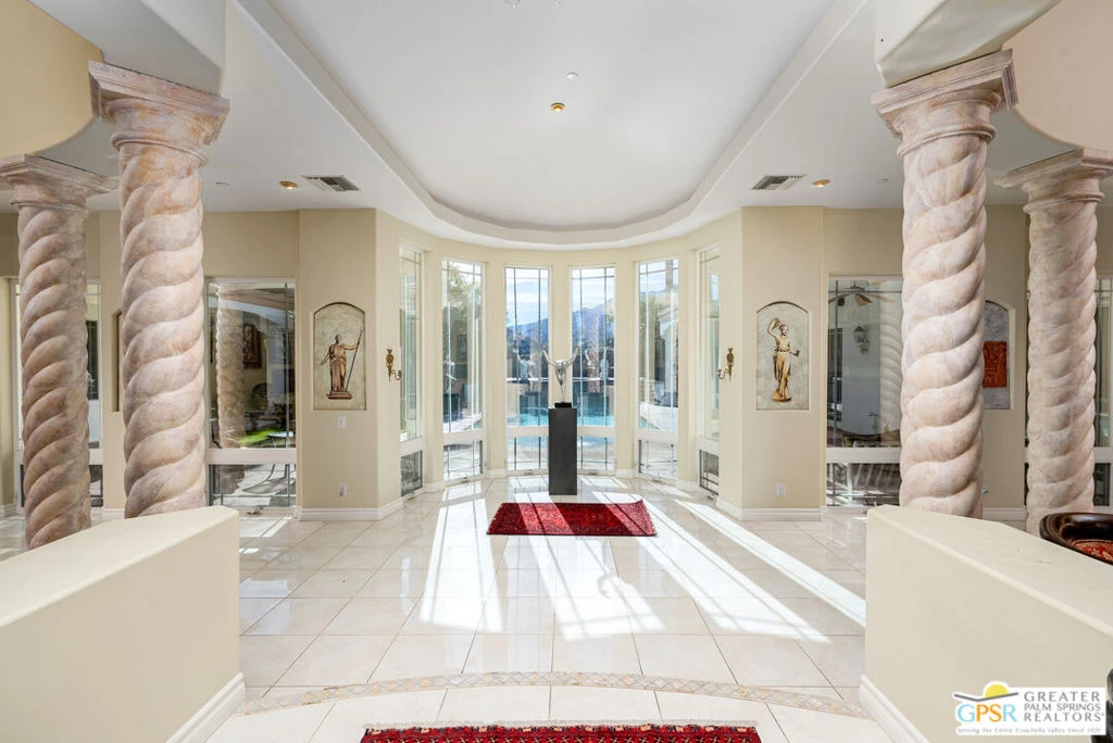 Investor Opportunity. Large Mediterranean estate in prestigious Andreas Palms. This 4 bedroom and 5 bathroom home spans 5,124 square feet of living space on ONE LEVEL, and has a 180 degree view from the backyard of southern and western mountains. Resting on a .65 acre lot, located in the south Palm Springs community of Andreas Palms, this intimate gated community is home to expansive homes, nice neighbors and UNOBSTRUCTED panoramic mountain views. The enormous kitchen includes two preparation and serving islands, granite counters, stainless steel appliances with gas cooking and walk-in pantry. Open to the dining area and living room, the heart of the home resides here with a one-of-a-kind stone fireplace/surround and French doors to the back patio and pool. The floor plan is wonderful with a complete separation of primary and guest bedrooms on opposite sides of the home. Two guest bedrooms with ensuite bathrooms and outdoor patio access sit adjacent to the living room. The extra large primary bedroom hosts a seating area, walk-in closet and a separate bonus room with sink & mini fridge great for an office or fitness area. The spacious primary bath includes individual water closets with dual sink vanities, a large walk-in shower and an separate soaking tub. The lush green outside area of this home is an entertainer's dream with lavish pool & spa area surrounded by park like settings. The back yard boasts large covered sitting areas, mature landscaping, a private pool and spa that waterfalls into the pool. Capture unobstructed views from the upper spa patio with no one behind you. Additional features include a long driveway, 3-car garage, fee land you own, 32-panel solar system and 180 degree mountain views. Enjoy the peacefulness and inspiring mountain views with no one behind you. Your Palm Springs retreat home.