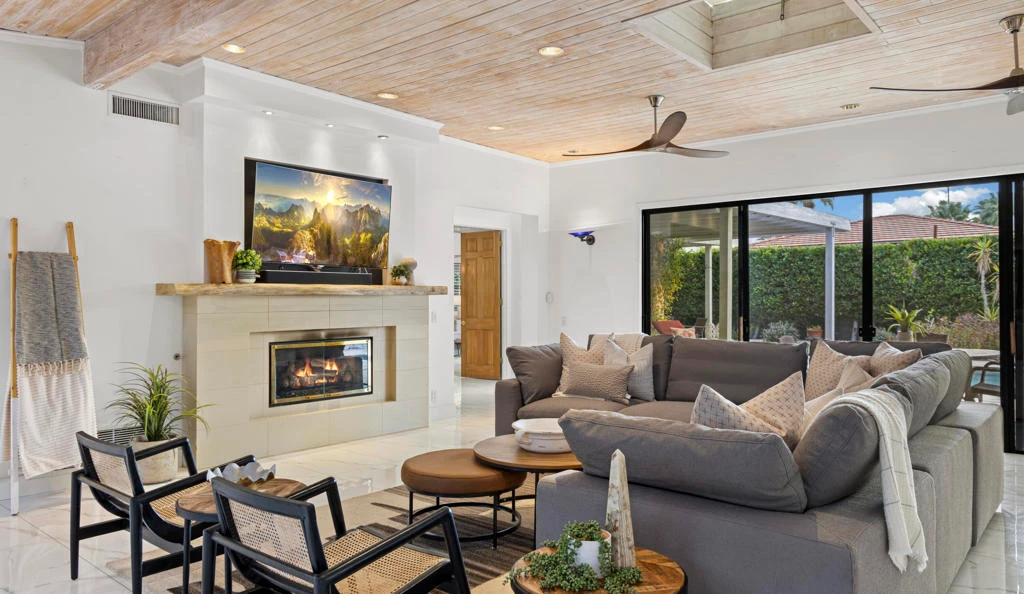 Step into this storied Palm Springs Estate. Historic Movie Colony East gem: This 5-bed/5-bath estate offers over 3400 sq ft of living space and sits on an expansive 17,860 sq ft lot. Once home to Irwin Shuman, owner of the world famous ''Chi Chi Club'' in Palm Springs, this entertainer's paradise hosted luminaries like Sammy Davis Jr., Eartha Kitt, Ella Fitzgerald, and Nat ''King'' Cole. The residence seamlessly blends vintage elegance with modern luxury. Exquisite marble floors throughout the main living area and kitchen complement the striking light wood-beamed ceilings, creating an elegant atmosphere. The master bath features a large walk-in shower and freestanding tub. Three fireplaces add warmth and character, while updated energy-efficient A/C and a paid solar system ensure low utility costs. The backyard oasis boasts a sparkling pool with plenty of separate outdoor spaces to enjoy the stunning San Jacinto mountain views. Prime location just 500 ft. from Ruth Hardy Park, with easy access to the Uptown Design District and downtown Palm Springs. This is your opportunity to own a piece of history in Palm Springs.