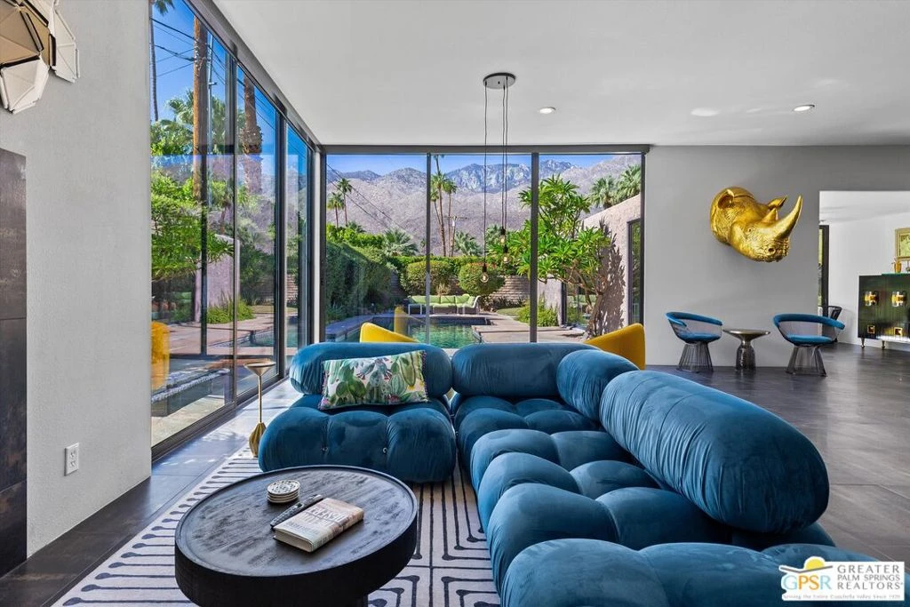 Located in the coveted Deepwell Estates neighborhood, this late-modern architectural home built in 1974 captures the essence of desert modernism with its sleek lines and commanding mountain views from both inside and out. Deepwell's location in the desirable south end of Palm Springs offers a unique blend of tranquility, walkability, and proximity to some of the city's best restaurants, midcentury landmarks, and resort amenities. Enter through a custom commercial glass door into a spacious living room with 10-foot Fleetwood floor-to-ceiling glass walls that open to a south and west-facing backyard; a seamless extension of the interior space and a perfect frame for dramatic sunsets. The kitchen features abundant cabinetry, generous counter space, and a casual breakfast area conveniently situated behind the main living and dining rooms. Recently renovated bathrooms bring a sophisticated, contemporary touch that integrates effortlessly with the home's original design. Currently set up as a 3 bedroom house, a 4th has been opened up and is used as a den or office but could be reconfigured back into another bedroom. One of the signature elements of this property is its dramatic ceiling height in the main living area, creating a striking connection to the surrounding mountains a defining hallmark of late-modern Palm Springs architecture.