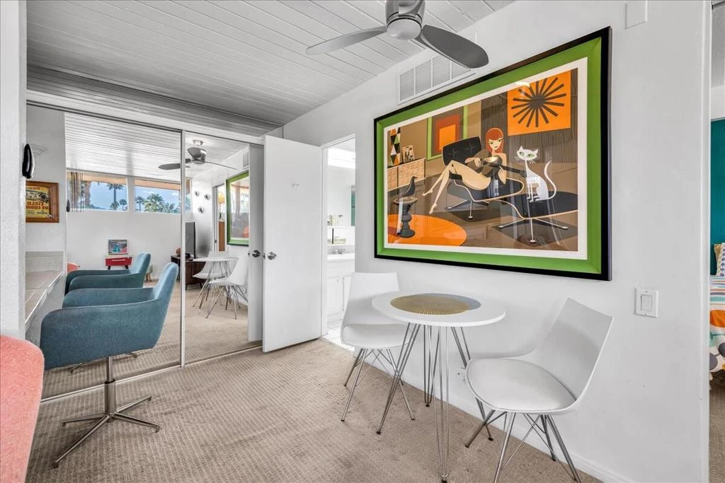 Short term rentals are allowed! The HOA dues include everything: water, electric, WiFi, internet, cable, trash, pool, spa, clubhouse, and gym. It's all about the breathtaking, unobstructed views from this top floor unit in Ocotillo Lodge, the iconic landmark community in South Palm Springs. This unit is on the inner side of the 2nd floor, away from the traffic of E Palm Canyon Drive. From inside, the clerestory windows offer poster-perfect views of palm trees, mountains, sunrises, sunsets, and the fabulous midcentury architecture of the complex and adjacent Twin Palms neighborhood. This unit has tons of the original 1957 charm along with some thoughtful updates. The huge skylight over the double sinks in the bathroom keeps this room light and bright. There's a semi-private outdoor deck area perfect for taking in the views while enjoying the amazing desert climate. This iconic building, situated on 10 acres of prime Palm Springs land, was completed by the Alexander Company in 1957 and designed by renowned architects William Krisel and Dan Palmer as their first Palm Springs project to showcase and market their second venture, the Twin Palms neighborhood.