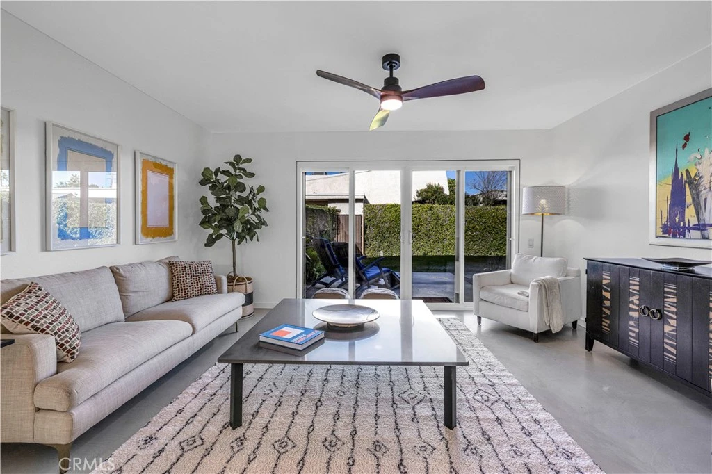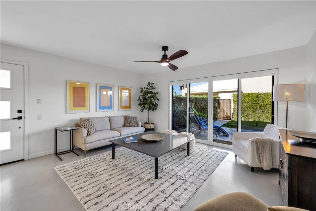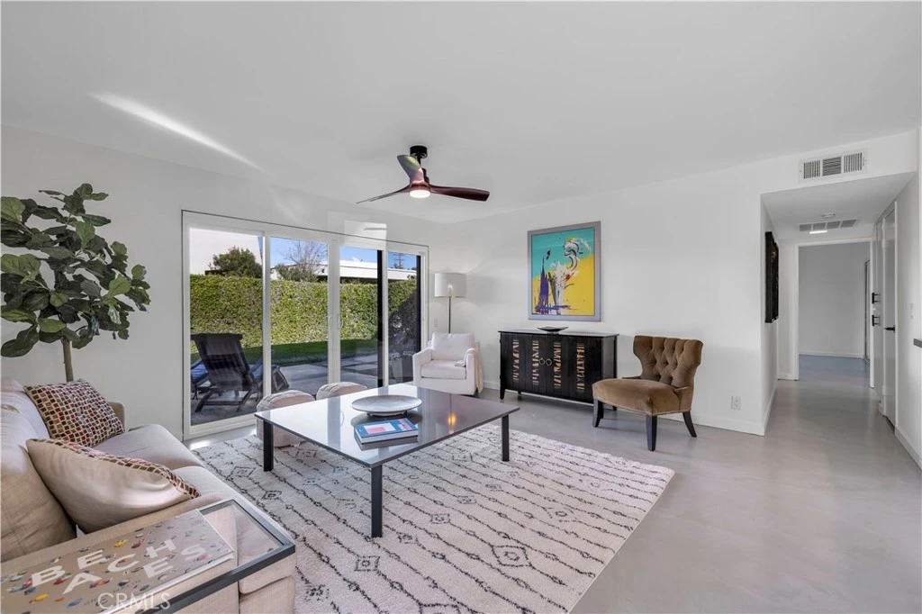 Welcome to Ramona Villas, a gated community designed by renowned architect Richard Harrison. This remodeled, single-level, 2 Bed, 2 Bath end unit is situated with only one shared wall, no neighbors above or below, and NO steps. The light-filled interior features skylights, New concrete flooring, New dual-pane windows and sliders, an open-concept living area, and upgraded kitchen and baths. The spacious primary suite includes two closets, a remodeled ensuite bath, and direct patio access. A second bedroom is located across from the hall bath. Full-size stacked washer and dryer included. The private north and west facing Private backyard offers two covered patios, a lawn area, mountain views. Ideally located across from the clubhouse, saltwater pool and spa, fitness room, and sauna, and just steps to EV charging stations and tennis court. The end-space covered carport includes built-in storage cabinets plus an additional exterior storage closet. This secure gated community is just minutes from downtown Palm Springs dining, shopping, and entertainment. Unit is unfurnished and 12 month lease preferred.