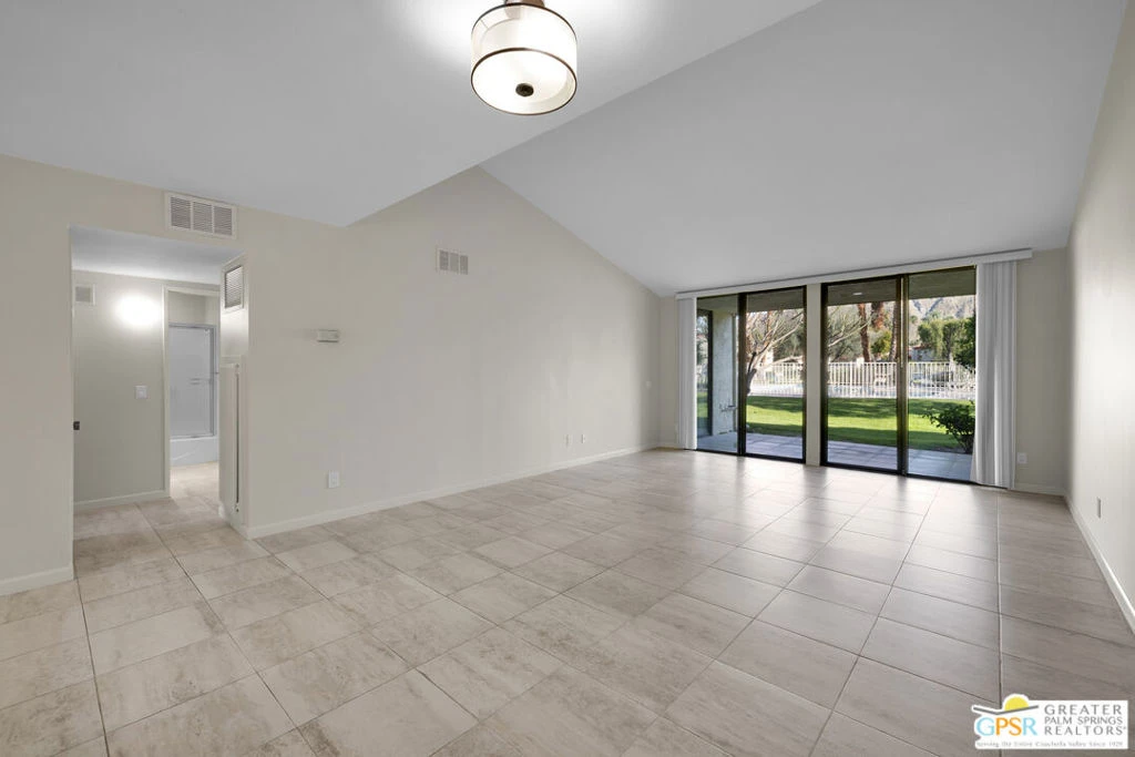 Located in the highly sought-after South Palm Springs neighborhood of Canyon Palms, Canyon South One is a low-density community of just 68 single-story homes, each with an attached one-car garage. This 2 BD / 2 BA condo offers 1,325 sq. ft. of living space and is not to be missed. Enter through a private front courtyard into the spacious open floor plan featuring tile flooring, vaulted ceilings, and gorgeous south-facing pool and mountain views. The generously sized primary bedroom feels like a private retreat with a dual-vanity ensuite bath, three closets, and patio access just steps from one of the community's sparkling pools and spas. An attached utility room with newer washer and dryer leads directly to the one-car garage. Canyon South One is a pet-friendly community (association rules apply). Monthly HOA dues include three community pools and spas, water, trash, and exterior maintenance including roof, stucco, and paint. Residents enjoy beautifully manicured grounds with walking paths winding among an abundance of fruit trees - lemon, lime, grapefruit, orange, and tangelo - along with mountain views in every direction. All this, plus nearby hiking trails and popular local hotspots including The Ace Hotel, Koffi, Mr. Lyon's, PS Underground, and Smoketree Village just a short distance from your front door. With Indian Canyons Golf Resort, Downtown Palm Springs, and Palm Springs International Airport just minutes away, this home is ideal as a full-time residence, seasonal retreat, or vacation getaway. Condos with this view rarely come on the market. Yes, you truly can have it all! Note: The HVAC system will require replacement and the home has been priced to reflect this. Property is located on private lease land (not tribal) with a lease expiration of 01/31/2072.