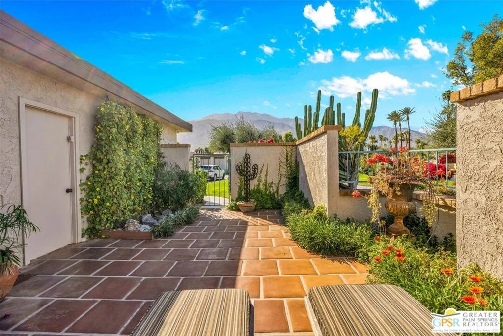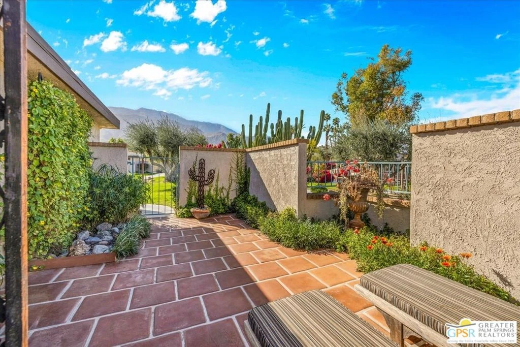 Experience the pinnacle of Palm Springs living in this meticulously reimagined 1,252-square-foot residence. Every inch of this single-level, two-bedroom, two-bath home has been transformed with luxury materials and thoughtful attention to detail. The open-concept layout is centered around a show-stopping Chef's kitchen, anchored by a 12-foot granite waterfall island with ample integrated storage, top-of-the-line Bosch stainless steel appliances, and a professional Zephyr range hood. Custom cabinetry with dovetail and soft-close finishes provides a sophisticated, tailored feel. From sunset cocktails to gourmet dinner parties, this Chef's kitchen blends high-design aesthetics with pro-grade performance for a truly elevated entertaining experience. The interior is bathed in light by added clerestory windows and premium Milgard energy efficient windows and doors. Porcelain tile floors flow seamlessly into the bathrooms, which feature custom tile work and lighted vanity mirrors. Additional upgrades include Bali Blinds, custom California Closets, Pelican water filtration system, a 16 Seer Rheem HVAC unit and recessed lighting. Enjoy true indoor-outdoor living from the front and back patios with hand-laid Saltillo tiles and breathtaking panoramic mountain views. Positioned on an incredible interior lot on a quiet cul-de-sac by the pond, bridge and walkways, you are just steps from one of the desert's most beautifully landscaped gated enclaves. Set within 43 acres of mature, park-like grounds, this premier gated community offers the ultimate desert playground with six sparkling pools, pickleball, and tennis courts. It is a serene sanctuary that feels worlds away, yet sits just minutes from the iconic energy of downtown Palm Springs. Impeccably reimagined and perfectly positioned, this isn't just a home; it's your new desert masterpiece.