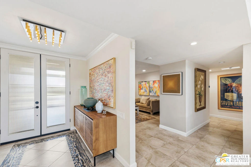 Mid-Century gem in the prestigious community of Canyon Estates, designed by Architect, Charles Du Bois. This 2600 Sq Ft detached condominium is a rare find in Palm Springs. Elegant clean lines, vaulted ceilings, generous light filled rooms, and clearstory floor to ceiling windows with mountain views make this cheerful home the perfect desert getaway.Beautiful details throughout include, ceramic tile flooring, plantation shutters, custom lighting, granite bar, built-ins, laundry area, finished two car garage and a covered patio that joins to all the main living areas. Large master suite features a walk-in closet, dressing area, and full master bath with a soaking tub, and shower. Two other guest bedrooms, one with en-suite bathroom and one is transformed into a den.Must see this wonderfully charming lifestyle home, amazing amenities included with the HOA fee include, Cable TV, Internet, Earthquake Insurance, ground maintenance, 9-hole, par-3 golf course, 15 community swimming pools, 12 spas, two championship tennis courts, pickleball courts, pool table, and a fitness center.