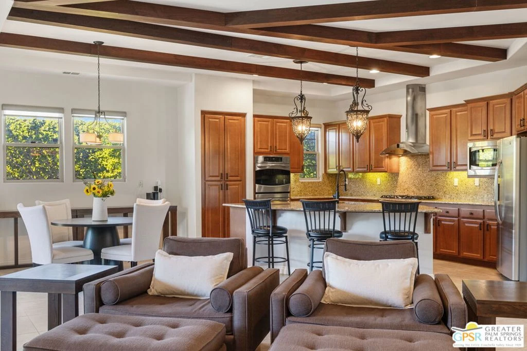Enclave at Sunrise, an intimate private cul-de-sac of only 52 homes, this Residence Plan Two, completed in 2013 delivers refined Palm Springs living with privacy, scale, and Mountain views. The interior is bright and architectural with soaring beamed ceilings, designer lighting, tile floors throughout, and expansive glass sliders creating a seamless indoor-outdoor connection. A formal dining space anchors the layout and flows naturally into the main living areas. The kitchen is both functional and elegant, featuring rich wood cabinetry, granite countertops, stainless steel appliances, double ovens, and a large prep island. It opens to a dining area and a spacious great room centered around a fireplace. The primary suite is a private retreat with a sitting area, and a spa inspired bath offering marble countertops, dual sinks, soaking tub, separate shower, and a generous walk-in closet. A well-appointed en-suite guest bedroom provides comfort and privacy. An attached private casita with its own entrance offers flexible use for guests or a quiet home office. The backyard is designed for resort style living with a covered patio, gas fireplace, built in BBQ, retractable awning, and a pool with tanning shelf and spa. Mature landscaping, lawn areas, and tall ficus hedges create exceptional privacy, while a gated side yard with trellis detail adds both form and function. Elegant, understated, and thoughtfully designed, this home offers a Quiet Luxury Lifestyle in one of Palm Springs' most desirable enclaves.