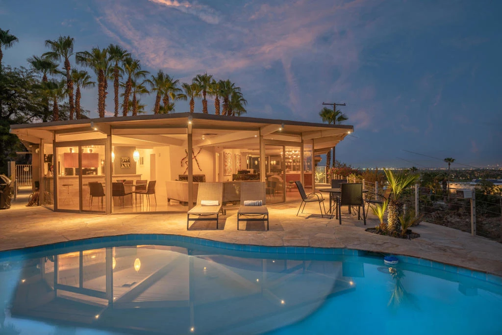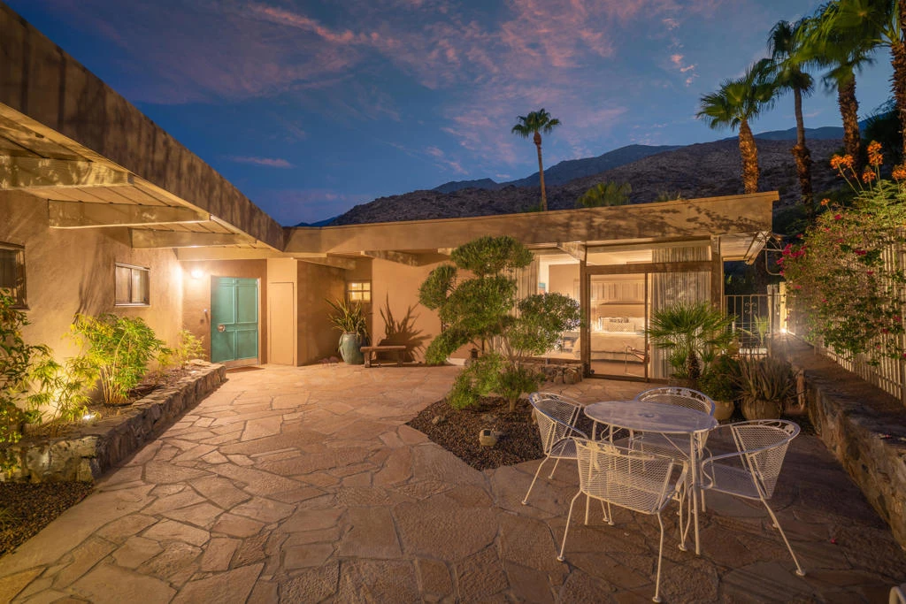 Available February-April 2026, Oct-Dec 2026 and all of 2027. Gorgeous remodeled mid century gem nestled next to the mountain in South Palm Springs offers privacy & DRAMATIC mountain and city lights view. You are welcomed through the private gated courtyard with beautiful flagstone patio. Relax around the fireplace, wet bar & piano in the living room with walls of sliding doors that open to the back patio/pool and VIEW! Cook up some fun in the charming kitchen with breakfast bar & dining area adjacent to the living room. The master bedroom suite (king bed) is on one side of the home; 2nd bedroom suite (queen bed) is situated on opposite side, with sliders that open to the courtyard. Completely remodeled with Terrazzo flooring in all main living spaces, new carpet in both bedrooms, new bathrooms, new kitchen with Caesarstone counters & fixtures, new laundry room, all new electrical & copper plumbing. Outside walls were taken down to the studs, home re-insulated & freshly painted throughout. $5000 security deposit/$500 cleaning fee. Owner covers weekly pool/gardener service, landline phone, cable, water, internet, trash and combine gas/electric up to $300 month. Small dog with owner approval and add'l $1000 pet deposit. Two month minimum lease. Tenant to use owner's cleaning service twice per month and pay cleaning company directly ($300 per cleaning-subject to change.)