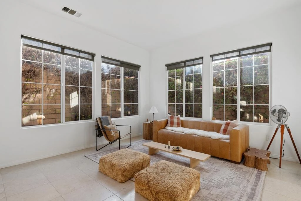 European-style move-in ready home in the coveted gated Pintura community with stunning San Jacinto mountain views located in the historic Araby Cove area of South Palm Springs. Professionally renovated by Flair Design and Build, Inc. in 2025 with architecture details inspired by the Balearic Islands, this two-level residence blends rustic elegance and low-maintenance living. The main level showcases a dramatic carbon-tiled wall gas-log fireplace, a custom media cabinet with a natural oak shelf, Italian travertine flooring, and a sophisticated kitchen appointed with taupe Caesarstone slab countertops, Spanish tile backsplash, natural floating shelves, stainless steel appliances, and a premium Sub-Zero refrigerator. The open layout creates an inviting flow for both everyday living and entertaining. Upstairs, the home features dual oversized primary suites, each with walk-in closets, and solar shades providing comfort and privacy. The main primary suite, office/loft area, and private balcony all capture breathtaking mountain views! Bathrooms upgraded with travertine flooring, showers, countertops, and custom oak-framed mirrors. Additional highlights include an attached oversized high-ceiling two-car garage with epoxy flooring. Residents of Pintura enjoy a charming Tuscan village ambiance with cobblestone streets in a secure gated setting at a low HOA, just minutes from downtown Palm Springs, PSP, renowned hiking trails, Koffi, and an array of popular neighborhood restaurants and cafes. This home is sold fully designer-furnished for a seamless, turnkey experience.