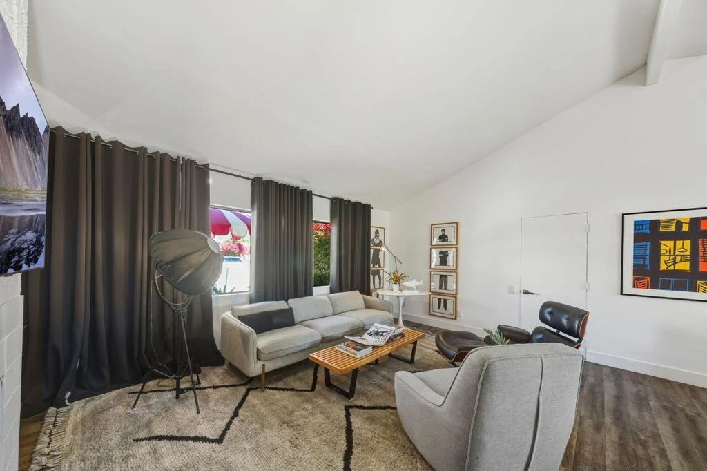 Reduced price. Move-in-ready single-story 3BD/2BA home, designed by Hugh Kaptur, only attached at the garage. Like a single-family home! Located in the gated community of Sunshine Villas in south Palm Springs, the 1.342 sq. ft. corner-lot home offers privacy, abundant natural light, expansive mountain views, and easy indoor-outdoor flow. The setting is exceptionally convenient, positioned across from Sunrise Park, the City pool, and skate park, with quick access to shopping, dining, and downtown. Inside, the home has been extensively updated with a newer HVAC system, water heater, flooring, baseboards, and electrical outlets. The kitchen features a white quartz waterfall island and backsplash, along with stainless steel appliances. Both bathrooms have been refreshed with modern vanities and touchscreen-lit mirrors. The home has been freshly painted museum white, including the garage, and complemented with new lighting, including two Italian designer modern fixtures. The garage and back patio are finished with commercial-grade carpeting, and a separate covered patio provides a private space for outdoor dining or morning coffee. Sunshine Villas offers four pools and spas, four newly painted pickleball/tennis courts, a bark park. This home has completed Phase 2 of the community's desert landscaping project, which has already reduced water bills and maintenance costs with upgraded irrigation. A significant advantage is that the Seller has paid all fees to extend the land lease to 2076 (51 years), with a unique successor land lease at $190 per month for the next 17 years, far lower than many newer leases in the area. Optional furnishings are available outside of escrow for buyers seeking a more turnkey home. This renovated Kaptur-designed home combines architectural appeal, modern updates, and a central Palm Springs location, ideal for full-time living, seasonal use, or as an investment property. This one you will want to see!