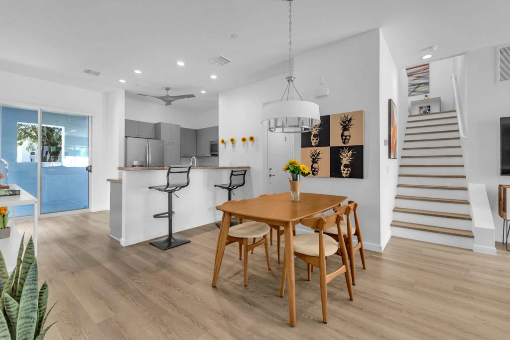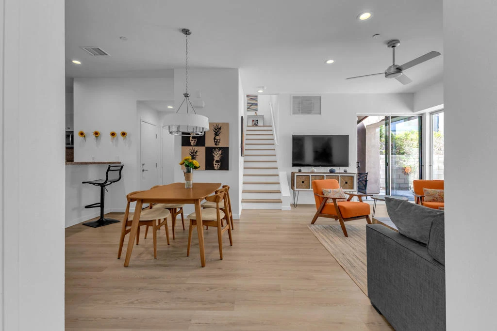 This beautifully maintained Model D floor plan offers modern design and an open-concept layout, nestled in the heart of the highly sought-after Palermo community just 5 minutes from Downtown Palm Springs. This particular unit does not share any adjoining living-space walls on either side, providing an added sense of privacy along with a quieter, more peaceful environment. Enjoy spacious living and dining areas that create an inviting space for both everyday living and entertaining, while the primary suite boasts a private balcony positioned to capture stunning sundeck views of the San Jacinto Mountains. Offered almost entirely furnished (an exclusion list is provided), this home is move-in ready and ideal as a full-time residence, seasonal retreat, or investment opportunity. Residents of Palermo enjoy gated security, a stylish clubhouse with a lounge and billiards table, a fitness center, and two sparkling pools and spas. Low HOA dues cover water, trash, roof, and exterior maintenance. Situated on Fee Land (you own the land), this property offers the perfect blend of resort-style amenities, mountain views, and prime Palm Springs living. A full inspection report was completed in February 2023, and the AC and pool have been serviced since, which provides added peace of mind.
