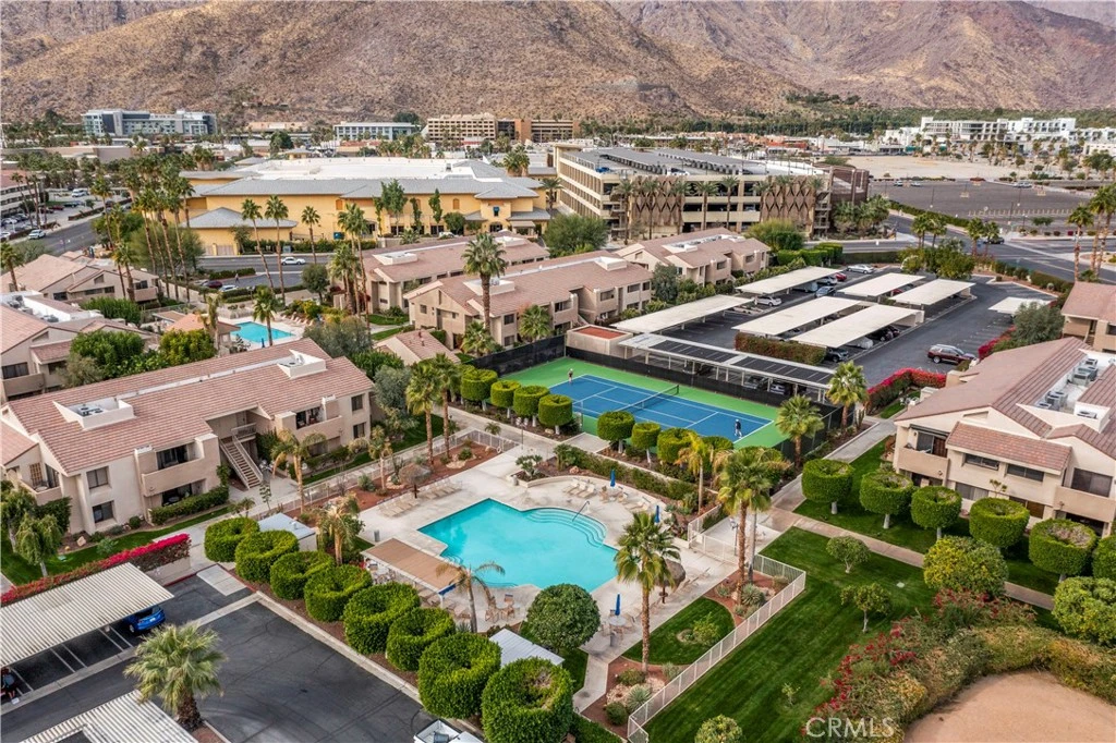 Experience your own desert retreat at Plaza Villas, a highly sought-after community nestled between the Agua Caliente Casino and the Convention Center in the heart of vibrant downtown Palm Springs. This prime location offers the perfect balance of convenience and investment potential, with a 7+ day minimum for short-term rentals, making it an exceptional income-generating opportunity. Whether you're looking for a personal getaway or a profitable property, this 2-bedroom, 2-bathroom condo is the ideal choice. Inside, you'll find a spacious open floor plan featuring a large living and dining area, along with a fully equipped kitchen. Additional perks include a full-size indoor laundry and a balcony with stunning mountain views. The well-maintained, security-gated community boasts lush landscaping with fragrant citrus trees, two sparkling pools, spas, and tennis courts—all set against breathtaking mountain vistas. HOA fees cover landscaping, water, trash, cable, and internet, providing ease and peace of mind. Assigned covered parking and guest parking are conveniently available on-site. Plaza Villas offers both tranquility and easy access to all the excitement that Palm Springs has to offer. Don't miss this rare opportunity to own a piece of paradise in downtown Palm Springs!