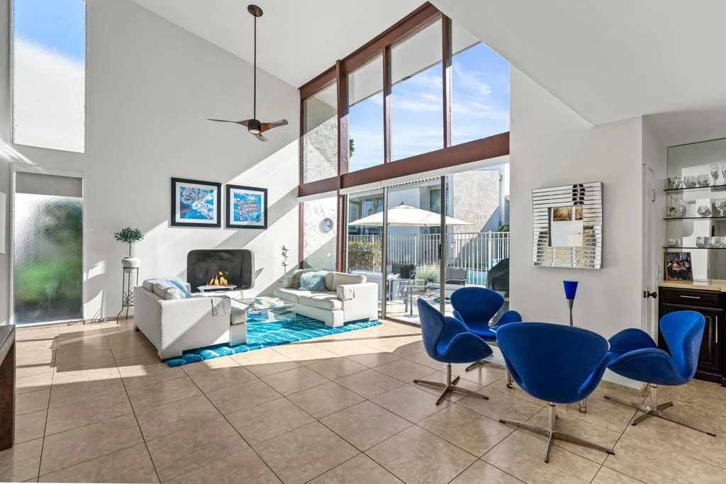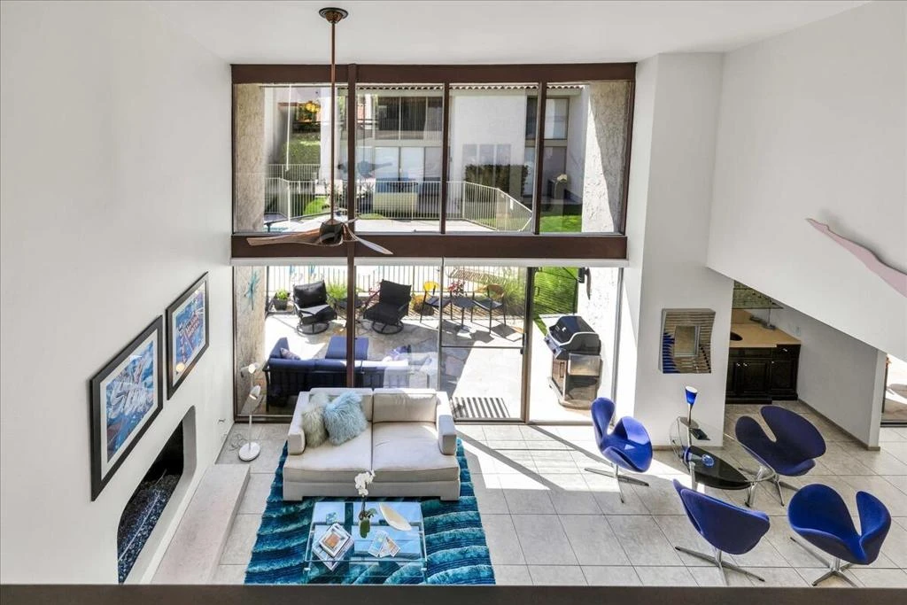 William F. Cody, FAIA, 1977. Casa Canyon, New York style Townhouse in South Palm Springs on FEE SIMPLE land. Stunningly conceived by Cody, reflects a sophisticated lifestyle more akin to Manhattan than to Southern California. This stand alone, detached townhouse offers 3 bedrooms/ 3 bathrooms in 2355 SF. The impressive double-height living room with 'atelier' style south facing windows and sculptural fireplace set the tone for this impressive architectural statement. A chef's kitchen, formal dining room, bar-lounge area, living room, den (easy BR#3) Butler's pantry with laundry, and a 3/4 bathroom on the first level alone. Upstairs, the primary bedroom features vaulted ceilings, walk-in closets, an updated bath and abundant natural light. The guest bedroom loft has its own full ensuite bath, walk-in closet and custom privacy shades. Completing this unique lifestyle is a deeded two-car carport adjacent to the unit with the pool and spa just steps away. Custom window coverings, updated kitchen, most furnishings available outside of escrow. Casa Canyon is a beautifully maintained community with 3 pools/spas with incredible mountain views, located in the coveted ''less windy'' south end. Indian Canyons Country Club, hiking trails, and the village are all close by. Casa Canyon (nee) Brevoort West is featured in the new book, Canyon Country Club, History and Design of Palm Springs' Garden of Eden by Steve Treinen.