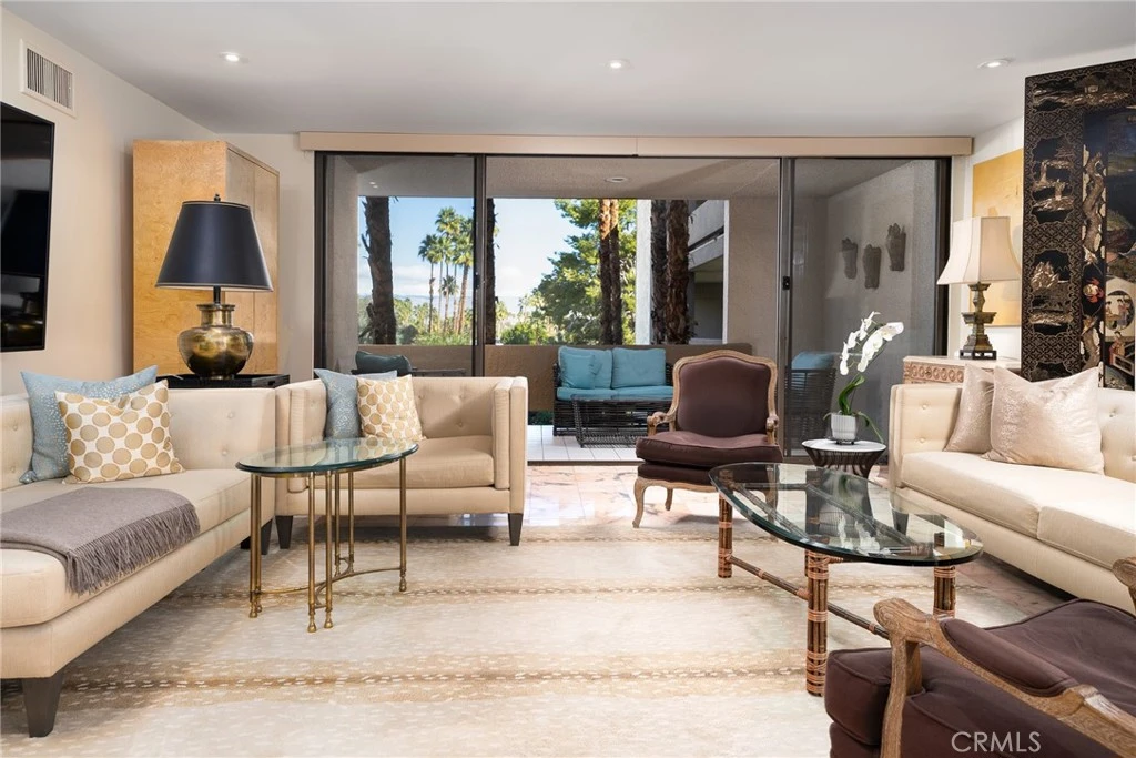 Welcome to The Diplomat—an iconic South Palm Springs address—where double doors open to a spacious two-bedroom home designed for effortless desert living. Floor-to-ceiling windows showcase incredible mountain and palm views, bathing the space in natural light and creating an inviting indoor-outdoor atmosphere. The extended galley kitchen is functional, featuring dual French-door stainless refrigerators, ample cabinetry, and a built-in office nook ideal for remote work or everyday planning. A mirrored wet bar connects seamlessly to the open living and dining area, where upgraded lighting sets the perfect mood for relaxing evenings or entertaining guests. The primary suite is a true retreat with double sinks, a walk-in closet plus an additional slider closet, and peaceful views. A well-positioned guest bedroom and nearby three-quarter bath add flexibility for visitors, hobbies, or a home office. Enjoy the ease of secure underground parking with elevator access, just steps from your front door. Developed by renowned builder Robert Grundt, The Diplomat is admired for its striking sculptural architecture, lush landscaped open space, and resort-style amenities, including a sparkling pool and spa. The HOA includes Spectrum TV with premium channels, Wi-Fi internet, water, and trash, making ownership refreshingly low-maintenance. Just across the street from Smoke Tree Village, you’ll have markets, boutique shops, a pharmacy, and local restaurants right at your fingertips.