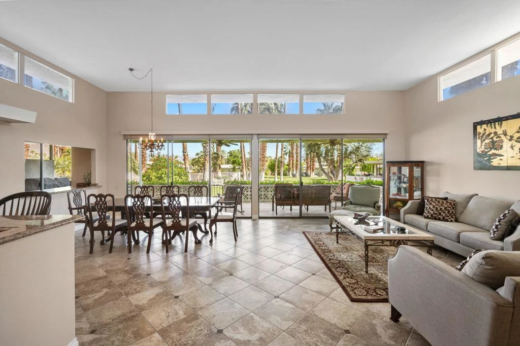 Illuminated by an abundance of natural light, this fully furnished single-level home in Canyon Estates spans an impressive 2600 square feet. It encompasses a welcoming Great Room, two generously sized Bedrooms, a spacious Den/Media Room, two Full Baths, a Powder Room, dual central HVAC systems, and an attached 2-car Garage.The Kitchen and Breakfast Room with custom-made wooden cabinets, tiled floors, a Gas cooktop, and granite countertops. The Master en suite, a pivotal feature, boasts dual sinks, a dressing vanity, a walk-in closet, a step-in shower, and an indulgent oversized detached tub.