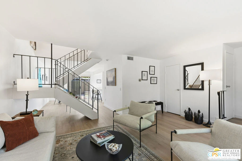Welcome to 250 E Via Escuela #C in the gated Indian Canyon Gardens community. This is your opportunity to own a fully renovated, high end remodel with a show-stopping staircase with open risers that separates the living and dining areas. Newly installed luxury vinyl plank flooring throughout, freshly painted throughout, all new electric plugs, switches, dimmers and screwless switch plates. The kitchen has white, high gloss, flat panel cabinetry with a gorgeous backsplash, stunning quartz counters and brand new stainless appliances. Nearby is the laundry area with a top loading washer and matching dryer. The newly renovated powder room completes the first floor. Upstairs the primary bedroom has been remodeled, has mountain views and has newly added primary bath with large format porcelain tile and Hans Grohe fixtures. To complete the primary suite is a thoughtful closet organization system. There are 2 additional bedrooms and a renovated guest bath with the same high end finishes. Brand new 18 SEER HVAC system, brand new Navien Tankless hot Water heater, dual pane windows throughout, ceiling fans in each of the bedrooms, plus new window coverings make for a very energy efficient condo. This well appointed home includes the furniture and furnishings with some exclusions. Outside, your private west facing patio space is perfect for relaxing and entertaining. Benefit from two side by side carport parking spaces and adjoining storage both with direct access to your patio. Dive into one of two sparkling pools or unwind in the spas within this well maintained and landscaped community. With its prime location, sought-after amenities, and low HOA fees, this Palm Springs retreat is ready for you to call home!