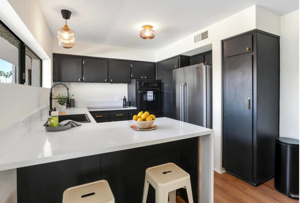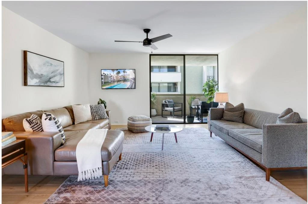 Beautifully renovated 2-bedroom, 2-bath condo on Fee Simple Land-you own the land- within the architecturally significant Casa Canyon community. Designed by renowned modernist architect William F. Cody, FAIA, this move-in ready home delivers the best of desert living, featuring mountain and pool views from the x-large private terrace, an updated kitchen and resort-style amenities. Offering approximately 1,345 square feet, this thoughtfully designed residence features an ideal split-bedroom floor plan providing excellent privacy between the spacious primary suite and guest accommodations-perfect for full-time living, hosting visitors, or seasonal use.The expansive primary suite includes dual vanities, a generous walk-in closet, and sliding glass doors opening to a private terrace showcasing picturesque mountain and pool views. The oversized living room shares terrace access, creating seamless indoor-outdoor living ideal for relaxing or entertaining.The modernized kitchen combines style and functionality with abundant counter space and storage, a large pantry, custom quartz countertops with waterfall bar seating, brand-new refrigerator, ceramic cooktop, dishwasher, and contemporary finishes throughout. Residents enjoy fee simple ownership along with community amenities including a resort style pool within one of the most desirable neighborhoods in South Palm Springs and surrounded by scenic hiking trails. Just minutes from downtown Palm Springs shopping, dining, and entertainment, this property is ideal as a primary residence, vacation home, seasonal desert retreat, or investment opportunity offering exceptional flexibility, architectural significance, and timeless Palm Springs lifestyle appeal.Additional features include a large private storage room off the terrace, one assigned covered carport space, and ample guest parking.**This condo was staged and is shown unfurnished.