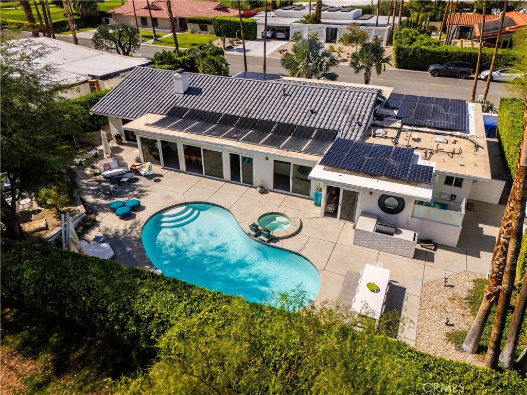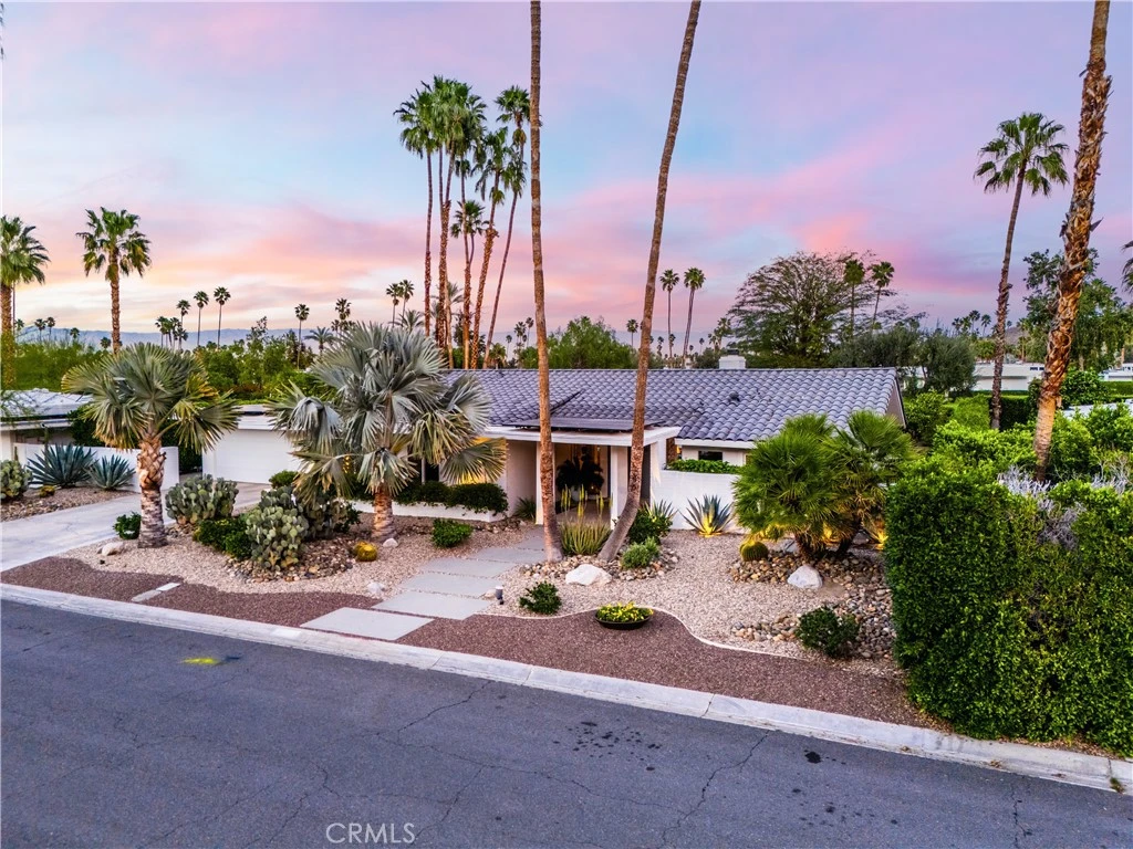 This stunning **mid-century designer home** in the coveted **Indian Canyons** neighborhood of **Palm Springs** backs up to the prestigious **Indian Canyons Golf Resort**, perfectly positioned along the **2nd fairway of the North Course** for exceptional privacy and scenic golf course views. Guests are welcomed through an **Albert Frey–inspired concrete and stone entry with portico**, where floor-to-ceiling glass floods the home with natural light and creates a seamless indoor-outdoor connection. Inside, the thoughtfully designed interior features **smooth-texture drywall, frameless solid-core doors, and sleek Intek door hardware**, creating a refined and modern aesthetic throughout. The **gourmet kitchen** showcases striking black Nike marble countertops, European-style cabinetry, and **all stainless steel appliances**, complemented by a spacious **butler’s pantry** for added storage and prep space. A stylish wet bar enhances the home’s entertaining appeal. Luxurious finishes elevate every space. 3D ceramic tile from Ukraine accents the front entry and select bedrooms, while premium Ann Sacks tile highlights the bathrooms. The primary suite bathroom offers illuminated LED mirrors and breathtaking views of the snow-capped San Gorgonio Mountains. Designed for both relaxation and entertainment, the home features Polk Audio ceiling speakers throughout, with pre-wiring for a 9.2 theater audio system, as well as outdoor and primary bedroom speakers. A spacious laundry room/pantry with skylight brings additional natural light into the home. Step outside to a private resort-style backyard framed by mature shade trees, lush palms—including striking Bismarck palms in the front yard—and privacy hedges. With no overhead power lines, the setting feels peaceful and uninterrupted. A dramatic wall of windows across the rear of the home** creates a remarkable sightline from the front yard straight through to the backyard. The outdoor space features a **saltwater pool and spa with solar heating (9 panels)**, a **fire pit**, and an **elevated seating area** overlooking the yard with panoramic views of the **San Gorgonio Mountains** and **Indian Canyons**. This exceptional 4-bedroom, 3-bathroom residence blends iconic **mid-century modern architecture** with sophisticated contemporary upgrades, all in one of Palm Springs’ most desirable golf-course communities.