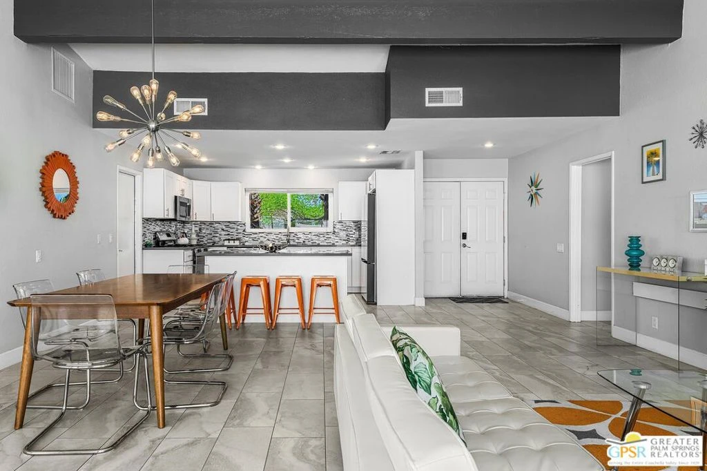 Set in the Desert Park Estates neighborhood, this updated Palm Springs home offers a seamless blend of comfort, function, and timeless indoor-outdoor living. Natural light fills the interior, where vaulted ceilings and tile flooring create an open, easy flow through the living, dining, and kitchen areas. A wall of double-pane sliders leads to the private backyard retreat, complete with pool, spa, gas fire pit and covered patio, all set against a backdrop of dramatic mountain views. Four bedrooms and two bathrooms include a spacious primary suite with dual vanities and direct access to the yard. Owned solar panels support energy efficiency, while mature desert landscaping with pops of color and texture enhances curb appeal and creates inviting spaces to relax or entertain. Tailored for easy living and designed to make the most of the Palm Springs lifestyle, this home is ready to welcome you. Schedule your private showing today!