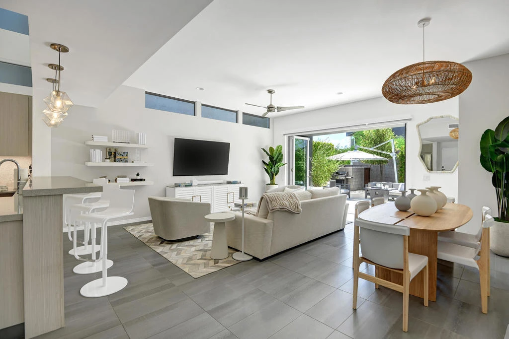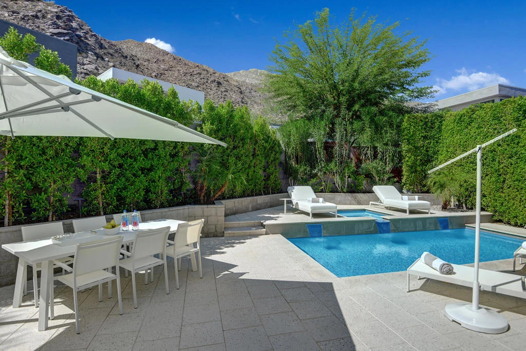 Located in South Palm Springs in the Dakota community. Situated on this special corner lot with mountain views on one of the larger lots within the community that offers a seperate rear yard in addition to the large pool area with a custom pebble tech pool with an elevated spa and upgraded tile decking.. This modern home has an open galley kitchen with Wolf appliances, quartz countertops and grey tile floors. two large primary ensuites with great mountain views and a loft/den and powder room . A two car garage also has storage, ja Culligan water system and a laundry area. This location is prime,, just a short distance to Melvin's, Spencers and so many favorite places to eat and shop are just a block away! YOU OWN THE LAND!