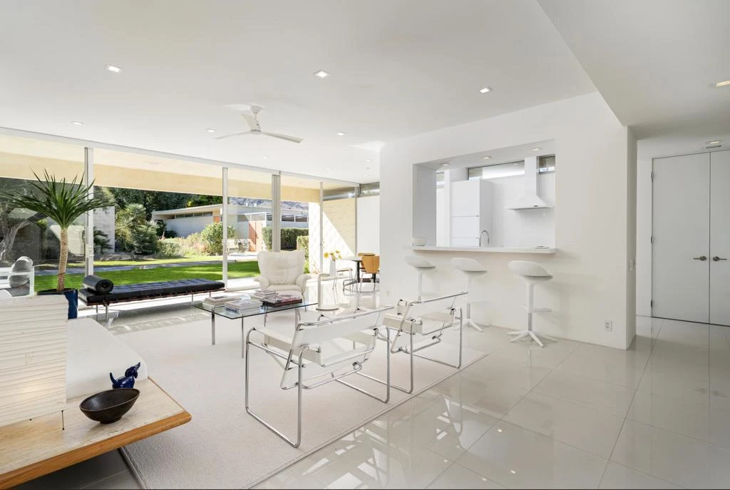 Step out of the warm desert sun and into the cool tones of a modernist getaway. This tranquil 2bed/2bath, in the desirable Seven Lakes Country Club, originally designed by Richard A. Harrison in 1967, has been thoughtfully reimagined as an elevated architectural gem. Inside its shadow-blocked walls, you'll be impressed by the home's minimalist style and spacious floor plan. Custom gallery walls display your personal artwork, while terrazzo tile flooring is highlighted with new lighting and ceiling fans throughout. The expanded new kitchen opens into the living and dining areas, adding a breakfast bar, with handsome Fisher & Paykel appliances blending into custom cabinetry and quartz counters. Walls of glass sliders lead to a green leisure terrace with views of mountains and iconic Southridge. The private courtyard, accessible from the living areas and secondary bedroom, is enclosed for maximum privacy and finished with new tile floors and dramatic landscape lighting. Spacious bedrooms offer sleek custom closets, including a built-in work from home space. Both bathrooms offer quartz counters, custom vanities and minimalist stacked tile walls. The primary has a large walk in shower and dual sinks with lit mirrors, while the guest bath has a Roman soaking tub. A new electric panel powers the Tesla EV charging station inside your covered parking. New roof, water softener and custom window coverings complete this perfect picture. Plus, your pool escape is just steps away. Past the 24-hour guarded gate, 'The Gem of the Desert' offers a unique elevated lifestyle with its Ted Robinson-designed 18-hole executive golf course, 15 pools and spas and lively William Cody designed clubhouse waiting to welcome you to its formal dining room, casual cocktail lounge and a terrace overlooking the famous Seven Lakes fountain. Welcome home!