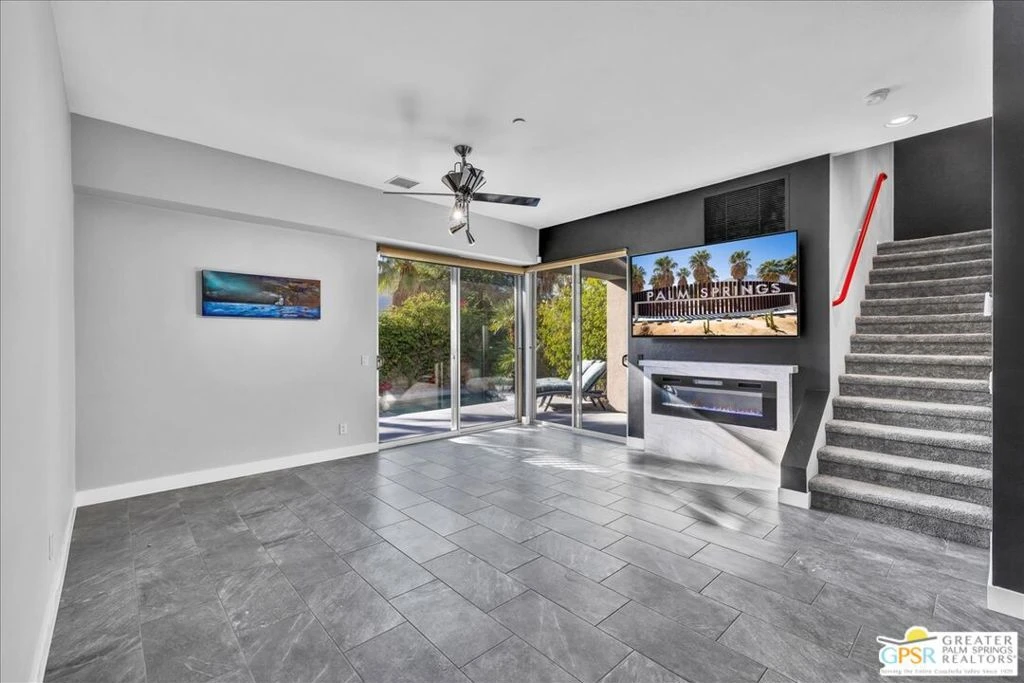 Modern Palm Springs Retreat with Private Pool & Spa and Mountain Views. Welcome to this stylish Palm Springs getaway, ideally located just minutes from downtown dining, shopping, and nightlife within the newer gated community of Palermo. Designed for effortless desert living, this sought-after floorplan offers two ensuite bedrooms, two-and-a-half baths, and an attached one-car garage - perfect as a full-time residence, second home, or vacation escape. Designer finishes elevate the home throughout, including high-end ceiling fans, custom window treatments, and thoughtfully curated details. As a perimeter unit, the property enjoys enhanced privacy and a beautifully landscaped backyard complete with a private pool and spa framed by mountain views - your own serene outdoor oasis. Inside, the updated great room features sleek 12x24 tile flooring, a custom fireplace with digital controls, and dual sliding glass doors that flood the space with natural light and showcase the surrounding scenery. The modern kitchen is both functional and striking, highlighted by quartz countertops, metallic tile backsplash, crisp white flat-panel cabinetry, stainless steel appliances, and a peninsula island with ample seating accented by contemporary pendant lighting. Upstairs, two spacious primary suites provide comfort and privacy, each with a custom-designed bathroom featuring distinctive stone countertops, designer tilework, and upgraded lighting. Generous closet space and convenient access to a generous rooftop deck and stackable washer and dryer complete the upper level. Additional features include sealed garage floors and an EV charger! Residents of Palermo enjoy resort-style amenities including a fitness center, community pools and spas, and a billiards room. HOA dues conveniently cover water, trash, exterior maintenance, and common-area amenities - making ownership easy and carefree. This is modern Palm Springs living at its best - private, stylish, and perfectly located in Palm Springs. ** Note all the walls have been freshly painted white! Must See!