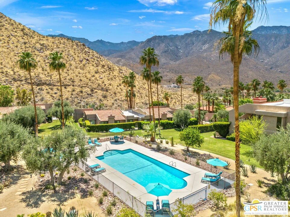 South Palm Springs living doesn't get more sophisticated or serene than this. Located on land you own in a private, elevated position within the coveted Andreas Hills enclave, this single-level, designer-renovated 2 bed + den (or optional 3rd bedroom) 3 bath condo offers the rare combination of refined interiors, generous scale, and stunning outdoor living that includes an expansive 1,100 sq ft patio AND enjoyment of 8 acres of park-like grounds, a large resort-style pool and spa, and multiple tennis and pickleball courts. Easy access to hiking trails and only minutes from golf, too! Step inside to soaring ceilings, statement finishes, and effortless flow. Key highlights include the dramatic great room with vaulted ceilings, a marble-wrapped fireplace, and oversized sliders that lead to a designer-created outdoor living area framed by 10-foot hedges to create ultimate privacy. Indoor-outdoor living at its finest! Back inside, the elegant wet bar with Cambria stone, smoked mirror backsplash, and Scotsman ice maker paired with the custom 10-foot banquette will set the stage for chic dinner parties. The all-new south-facing chef's kitchen is a showstopper! Designed for form and function, this kitchen has a large island, dual dishwashers, dedicated breakfast area, and seamless access to the outdoor BBQ terrace. Easy access to the attached two car garage, too! Three spacious rooms offer flexibility and comfort. Primary Suite opens to a private patio and features dual walk-in closets, a spa-style bath with Cambria and Carrera stone finishes, dual sinks, oversized walk-in shower, separate soaking tub. South-facing Junior Ensuite offers its own outdoor space and a beautifully updated bath. South-facing Den (or optional Bedroom Three) with vaulted ceilings, views, and access to a private patio, can flex as a media room, home office, or guest retreat with a full bathroom including a walk-in shower just steps away. Energy-smart with owned rooftop solar, too!