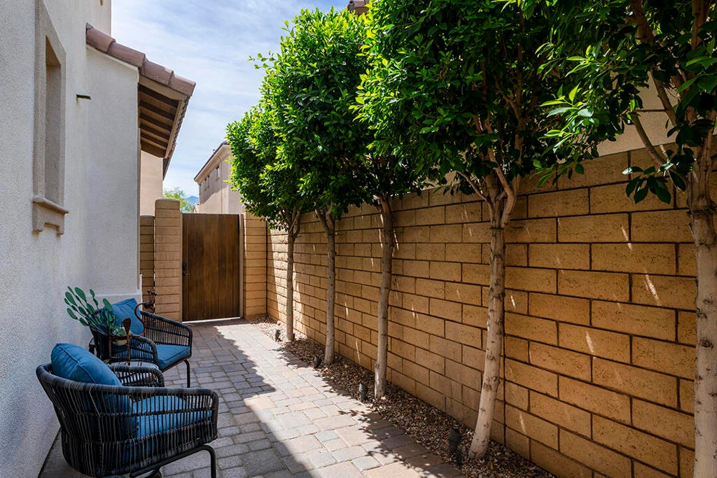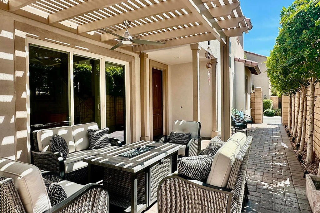 A detached 3-bedroom, 3-bath home just blocks from downtown Palm Springs for under $1 million is a rare find, and this free-standing condo in Village Traditions delivers. Blending contemporary design with traditional styling, the home features a soaring vaulted living space, dual primary suites on separate levels, and quality finishes throughout.A gated front entry leads to a private courtyard with a trellis-covered sitting area, accessible from the living room and main-floor primary suite. Inside, the open floor plan connects the living area, dining space, and chef's kitchen with prep island, while a dramatic staircase lines one wall, all beneath a two-story ceiling with upper windows that bring in natural light and mountain views.The kitchen offers dark wood cabinetry, stainless steel appliances, wine refrigerator, and quartz countertops, with a nearby laundry room for convenience. The main-level primary suite opens to the entry courtyard and includes a spacious en-suite bath with soaking tub, glass-enclosed shower, dual vanities, separate water closet, and a large walk-in closet. A second bedroom and adjacent 3/4 bath on the main floor provide flexible space for guests or a home office.Upstairs, a loft overlooks the main living area, creating an ideal office or lounge. The second primary suite features two walk-in closets, dual patios with south and west mountain views, and a well-appointed en-suite bath.Village Traditions offers a clubhouse, fitness center, resort-style pool and spa, and beautifully maintained grounds with mature landscaping and a neighborhood park. Its close proximity to downtown Palm Springs makes it perfect as a full-time residence or seasonal retreat.Additional Items and Amenities Carpet replaced, bathroom fixtures and toilets upgraded, installed ceiling fans | 2021-2022 Front entry walkway and patio expanded | 2021-2022 All canister lighting was replaced with energy-efficient LED, dining room and bathroom lighting fixtures upgraded. Dimmer switches added | 2021-2022 Electric and remote shades added to upper windows, manual roller shades added upstairs in office and bathroom. | 2021-2022 Garage updates 2023 | Insulated garage door installed, epoxy floor finish, added lighting and HVAC In-line air purifier added to the main HVAC | 2023 | Air compressor upgrades in 2025 Entry courtyard pergola installed by Valley Patio | 2023, Wind cooler in 2023, W/D upgraded 2024, Dishwasher replaced 2025