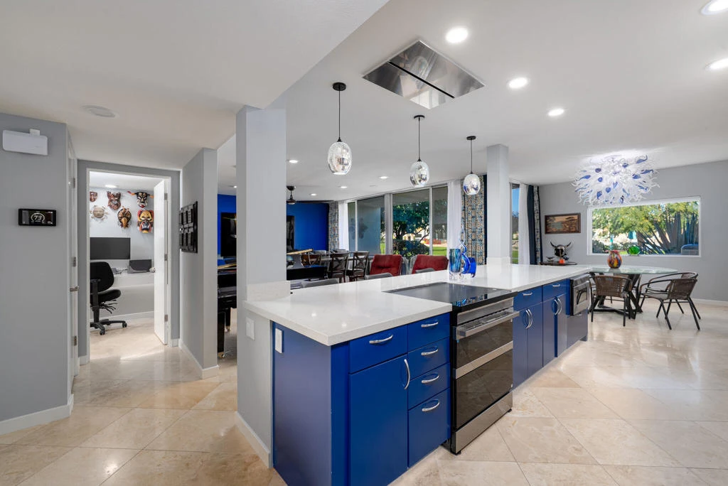 Experience the ultimate Palm Springs getaway in this stunning Mid-Century Modern retreat, beautifully renovated and originally designed by renowned architect Richard Harrison. This sophisticated 2-bedroom, 2-bath ground-level residence blends iconic mid-century architecture with modern luxury, creating the perfect desert escape with convenient single-level living and easy access throughout the home. The residence has been thoughtfully upgraded with high-end finishes and designer furnishings throughout. The stylish living room is designed for relaxation and entertainment, featuring a 98-inch television with cinema-style seating, creating a true in-home theater experience. A grand piano adds an elegant focal point to the open living space, while the chef's kitchen is fully equipped for cooking and entertaining.Both the primary and guest bedrooms feature king-size beds, offering exceptional comfort and a peaceful retreat after a day enjoying the Palm Springs sunshine. Carefully curated design elements enhance the home's luxurious yet relaxed mid-century aesthetic.Located within an exclusive guard-gated golf community, guests enjoy access to the Ted Robinson-designed golf course, clubhouse amenities, and beautifully maintained grounds, all just minutes from the renowned dining, shopping, and entertainment of downtown Palm Springs. This exceptional property offers the perfect blend of iconic design, comfort, and resort-style living for an unforgettable stay in Palm Springs.