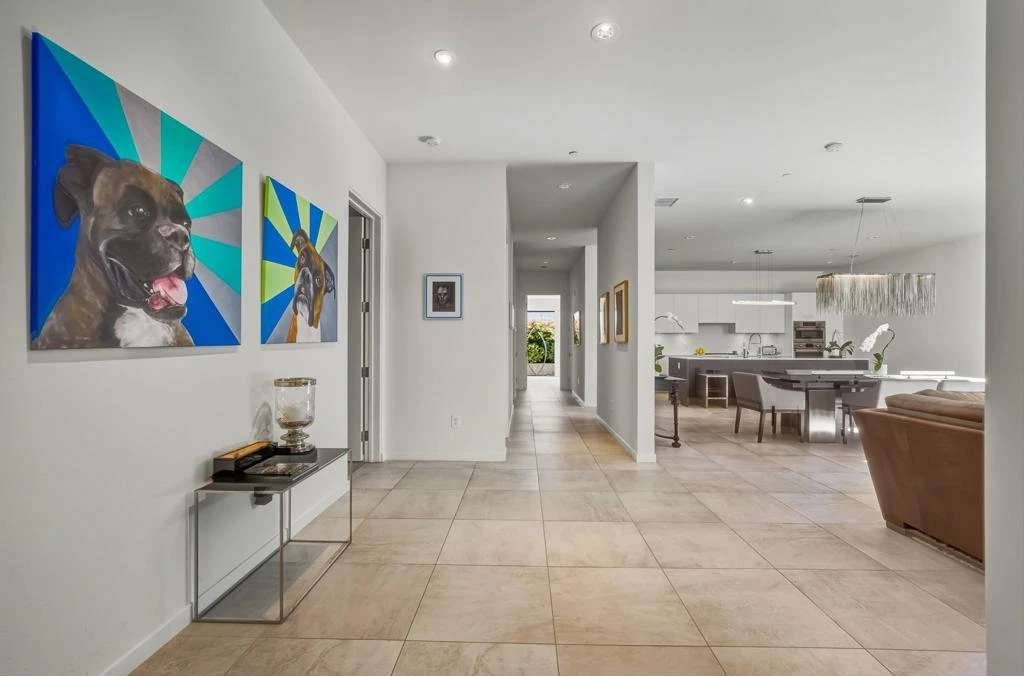 Welcome to Escena, where luxury meets contemporary elegance in this highly desired Anthony Poon designed home with AMAZING views of the San Jacinto mountains. This beautiful Alta Verde home features a wall of Fleetwood sliding doors that open to a front-loaded pool and spa, showcasing phenomenal views of the western and southern mountains. One of the larger homes in Escena, this home offers 2649 sq. ft. of luxurious living space with 3 bedrooms and 3 bathrooms. A chef's kitchen is a culinary delight with quartz countertops and backsplash, Italian designed cabinetry, stainless-steel Bosch appliances and an oversized island. The spacious open floor plan consists of the kitchen, living and dining areas, 10'+ high ceilings, porcelain tile flooring, a fireplace, custom lighting, and spectacular views. The expansive primary bedroom suite, extending the entire width of the home, has cornered Fleetwood sliding door access to a private back patio, a huge double-headed walk-in shower tucked behind dual vanities, and an extra amount of closet space, all organized by California closets. The two guest bedrooms share a Jack and Jill bathroom, with good separation from the Primary bedroom. This home offers Palm Springs indoor/outdoor living at its finest with dual sets of Fleetwood sliding doors opening from the great room to the outdoor patio and pool, perfect for entertaining or just relaxing in the sun as you revel in the unbelievable mountain views. Another Fleetwood sliding door opens from the kitchen to a lovely side yard/patio of pavers and artificial turf, perfect for relaxing or cooking on the outdoor BBQ. A blocked retaining wall spreads across the back of the property boasting lush landscaping, including beautiful bougainvillea bushes and Meyer lemon and tangerine trees. Lighting and landscaping surround the property, adding to the privacy of the outdoor space and its alluring night-time beauty. Additional highlights include motorized blinds in the great room and primary bedroom, a powder room for guests, a separate laundry room with cabinetry, 2-car garage, upgraded recessed lighting and 26 solar panels for energy efficiency. Escena is a highly sought after guard-gated golf course community with low HOA dues and resides on fee simple land (you own it). Do not miss this beautiful Palm Springs contemporary home, offering luxury, unparalleled comfort, style, and some of the best views in Escena!