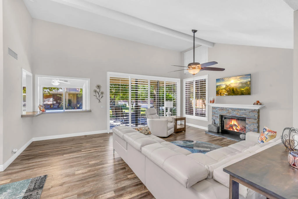 Discover this exceptional 3 bedroom, 2-bathroom residence, perfectly situated in the desirable West Gate community of Cathedral Canyon Country Club which features one of the largest floorplans. Quietly located at the back of the community, this well-appointed home offers privacy, convenience, and a desirable resort-style setting. This meticulously maintained home offers a blend of modern upgrades and timeless style, providing a turnkey experience for its next owner. As you step through the front door, you'll be greeted by soaring ceilings in the living room, which create an open and airy atmosphere. The custom fireplace serves as a stunning focal point, ideal for relaxing evenings. Durable and stylish dyno laminate flooring flows throughout the home, leading you to a fully upgraded kitchen. Here, you will find custom cabinetry with convenient slide-out drawers and a classic farmhouse sink. The home's thoughtful updates continue into the bathrooms. The primary suite offers vaulted ceilings, a walk-in closet, and a spectacular walk in shower. A guest bedroom with dual skylights connects to an updated bathroom with walk in shower and hallway access. Additional features include a separate laundry room and both bathrooms are equipped with modern bidet toilets for added comfort. Additional recent improvements include a new HVAC system for year-round comfort, an epoxy-finished garage floor, and new double sliding screens that invite in the desert breeze. The garage is exceptionally functional, featuring abundant built-in storage cabinetry along with a spacious ''attic'' area for even more storage options. There is nothing left to do but move in and enjoy the wonderful lifestyle this home and community offer. Don't miss the opportunity to make this beautiful property your own. Contact us today to schedule a private viewing and explore all that this Palm Springs gem has to offer. HOA includes landscaping, exterior maintenance, controlled access, and cable TV/internet. Ideal for full-time living, seasonal use, weekend golfers or an easy lock-and-leave lifestyle.